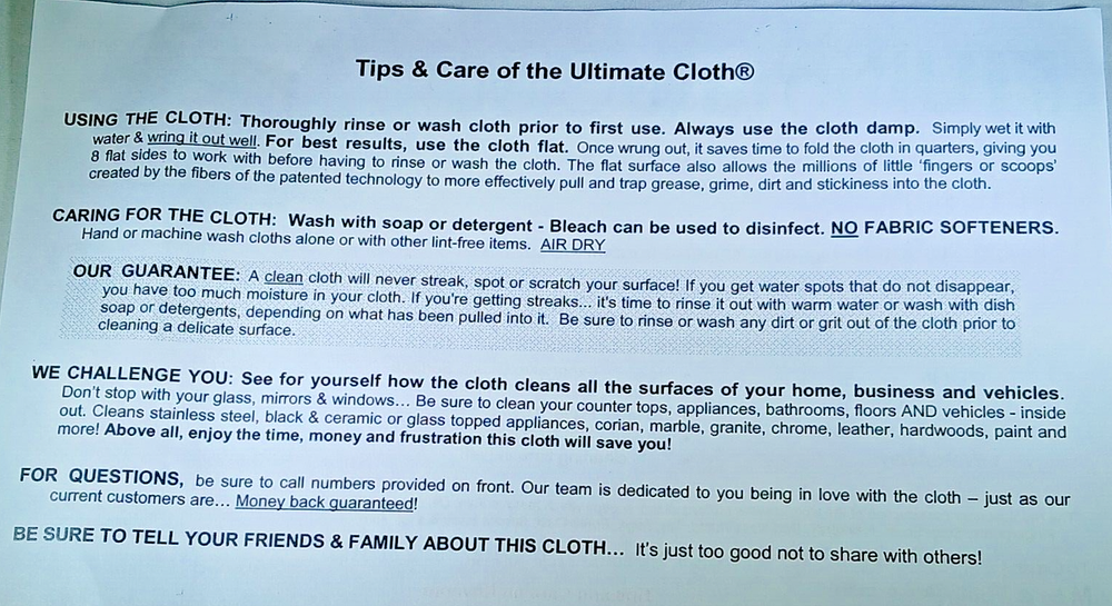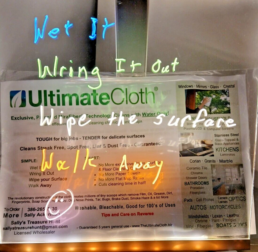 The Ultimate Cloth offers streak-free cleaning with water only, making it a convenient and eco-friendly option for various cleaning tasks. Made from MiraFiber material, this reusable cloth measures 15 inches in length and 13 inches in width, providing ample coverage for efficient cleaning. This white cloth is suitable for use in various cleaning tasks in and around the home. Manufactured in the United States, The Ultimate Cloth is a durable, bleachable and effective cleaning tool that helps maintain a clean with water only and tidy living space. Simply rinse well and wring out well and continue cleaning. Check out this seller's other listings. In addition the cloth for 1/$7, 2/$12, 5/$25, 10/$48 in numerous other listings. Your satisfaction is guaranteed on the purchase of the Ultimate Cloth or your money back. Manufactured in U.S.A. Also available in a 4-color pack for $20 also. Check out the seller's other listings for a variety of items.