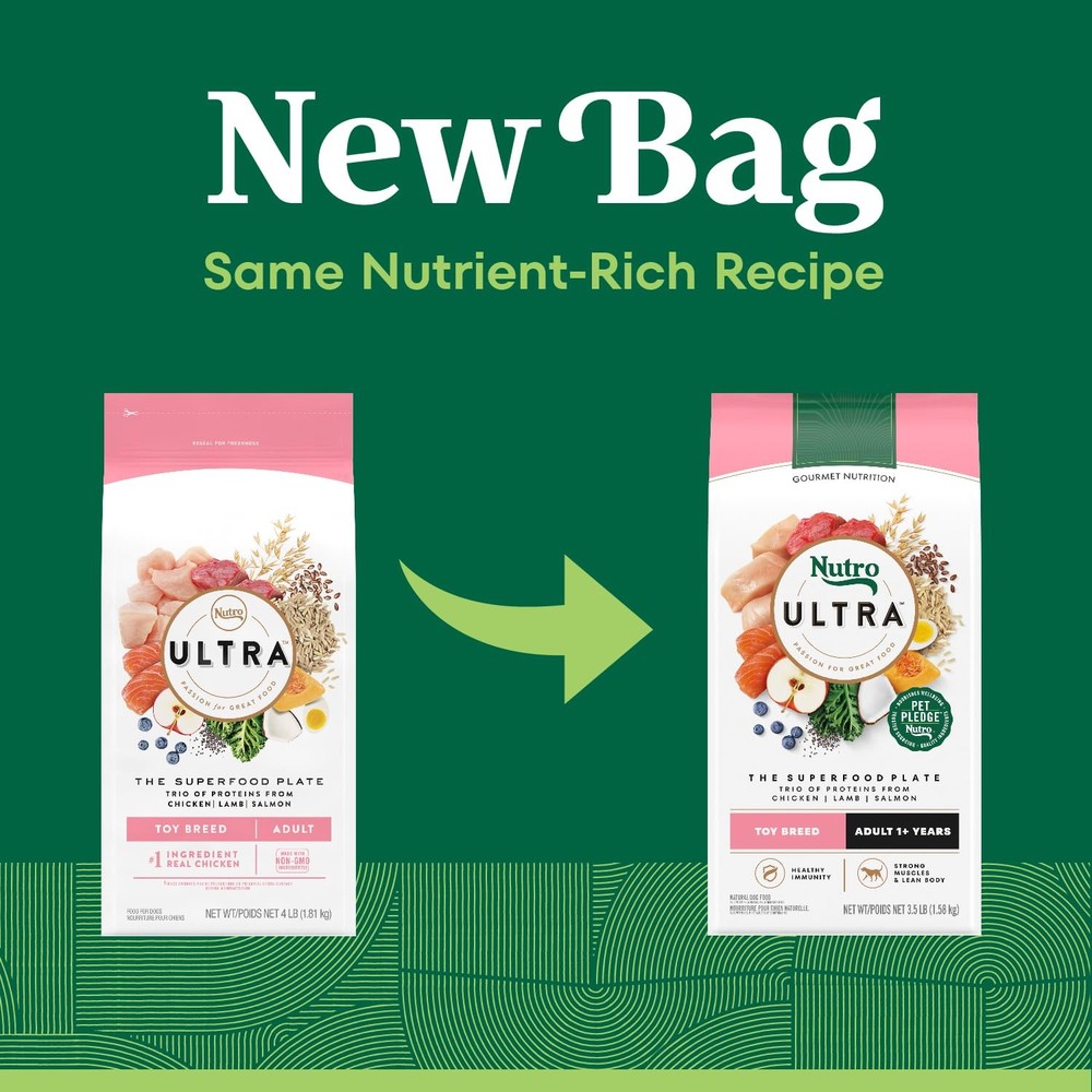 Ultra Difference: Ultra Adult Toy Breed High Protein Dry Dog Food provides high-quality ingredients like our trio of animal proteins and exclusive blend of 14 superfoods to deliver abundant flavor and gourmet nutrition your pet will love Quality Recipe: This dry dog food recipe is made with non-GMO ingredients; no chicken by-product meal, corn, wheat, or soy High-quality Protein: With real chicken as the #1 ingredient and high-quality protein from chicken sources, this dry dog food recipe supports strong muscles, a lean body, and serves delicious flavor that dogs beg for Healthy Immunity: Ultra Adult Toy Breed High Protein Dry Dog Food is made with essential antioxidants to support healthy immunity Radiant Skin & Coat: Ultra Adult Large Breed High Protein Dry Dog Food with a Trio of Proteins from Chicken, Lamb, and Salmon contains Omega 3 & 6 fatty acids for healthy skin and a radiant coat