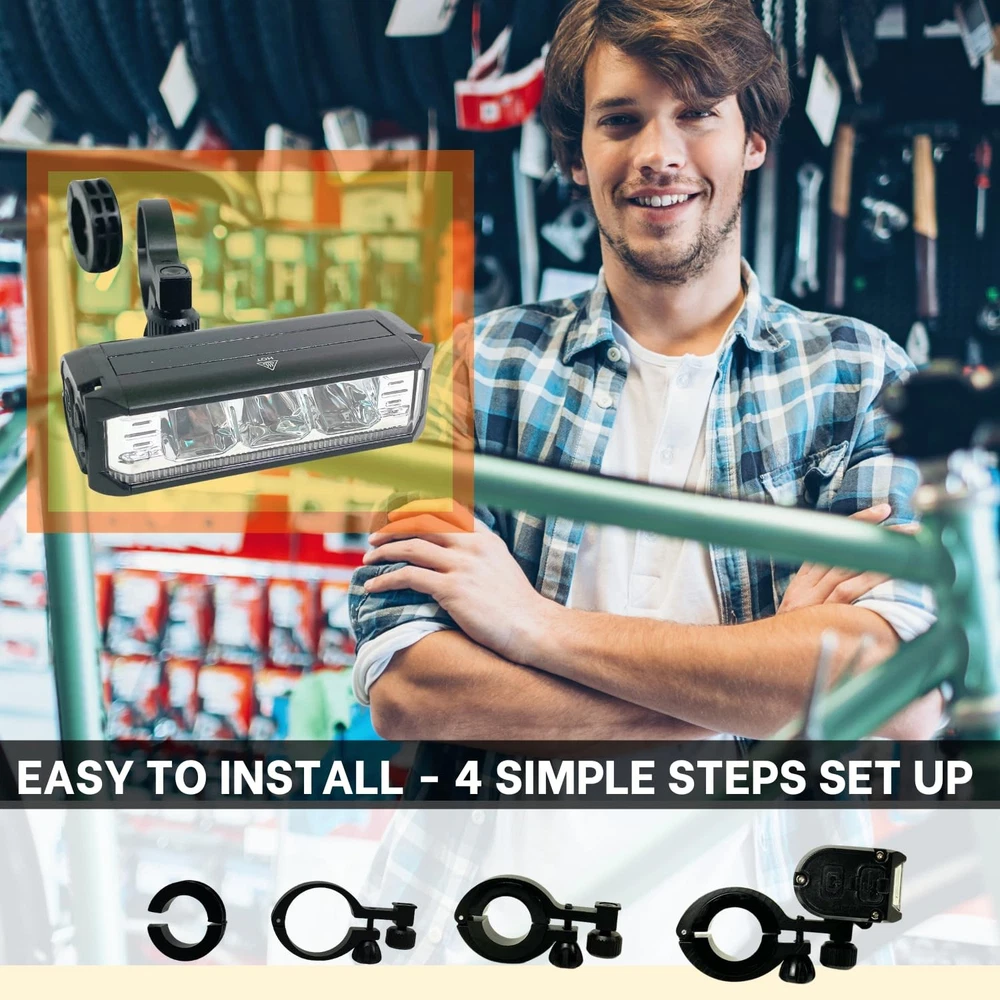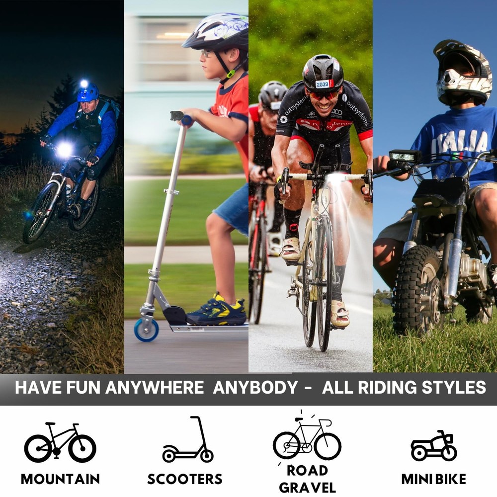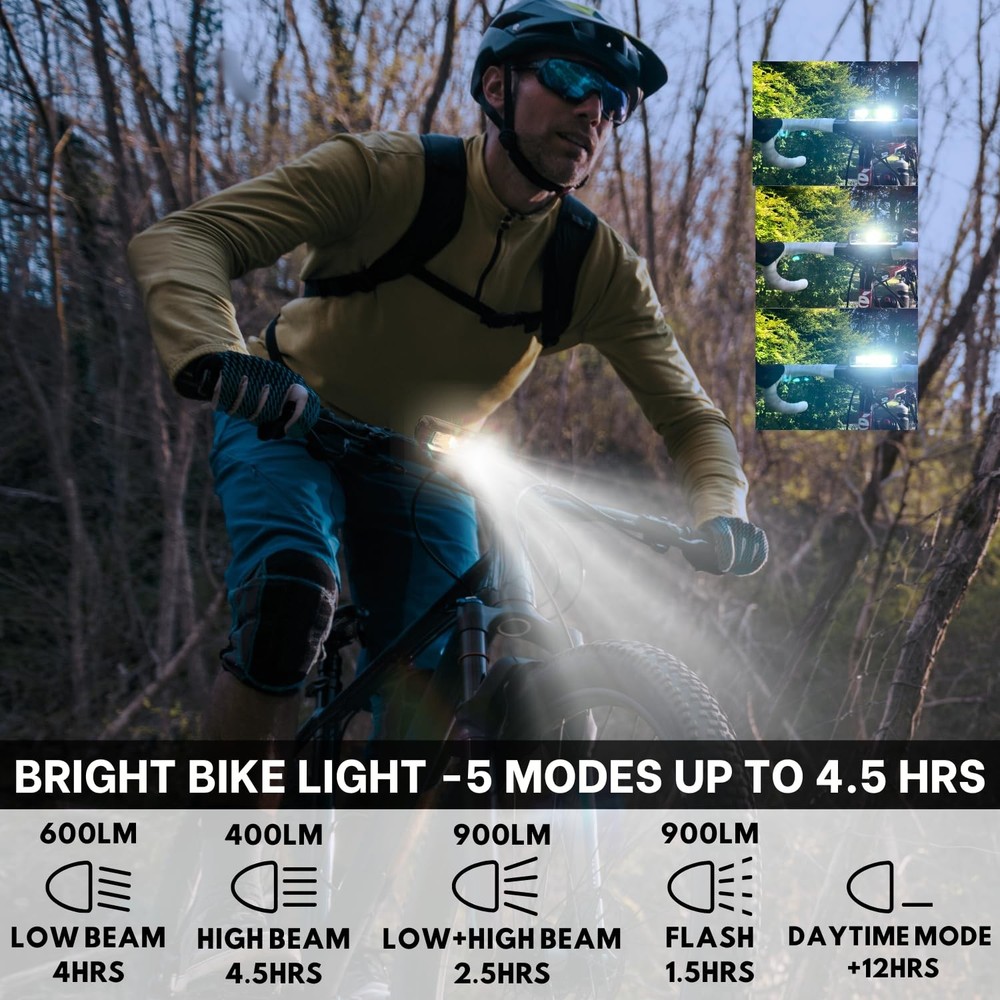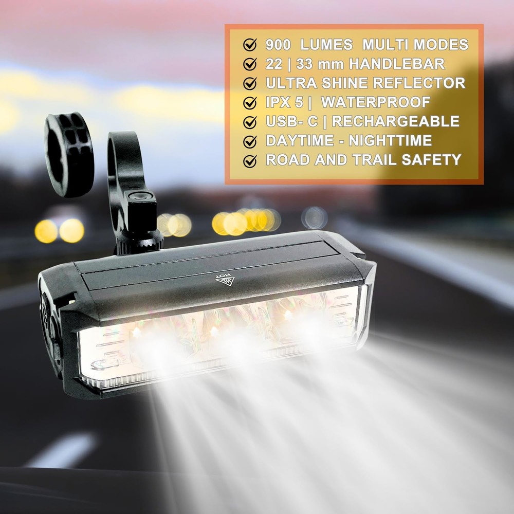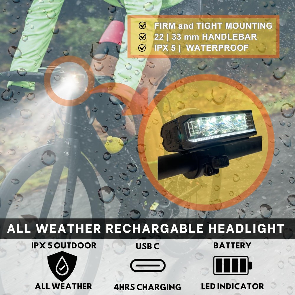 Introducing the Ultra Bright Bike Light, the perfect companion for your night rides! This rechargeable bicycle headlight is designed to provide maximum visibility and safety while riding in low light conditions. With different modes to choose, you can click to adjust the brightness and pattern of the light to suit your needs. The firm bracket makes it easy to install onto tubular handlebars, making it compatible with a wide range of bikes, scooters, mini bikes and electric bikes. Not only is this bike light incredibly bright and effective, but its also waterproof, so you can confidently ride in any weather conditions without worrying about malfunctioning. The high-powered LED lights ensure that you will be seen by other cyclists, pedestrians, and motorists on the road. Whether you are a commuter riding in urban areas or a mountain biker hitting the trails, this bike light is a must-have accessory for any cyclist. Its affordable price makes it an essential investment for anyone looking to enhance their safety while biking. So why wait? Add the Ultra Bright Bike Light to your cart today and enjoy the peace of mind knowing that you are equipped with top-of-the-line headlights for night riding. Do not let darkness hold you back from enjoying your favorite sports - invest in a sturdy and reliable bike flashlight today. La luz de manillar para bicicletas y scooters le provee de autonomia en una gran variedad de ambientes y condiciones climaticas, es resistente al agua y ofrece muchas intensidades the luz. Usela de dia y de noche. Perfect gift for him, Father's day Gift. ULTRA BRIGHT: Ultra clear long flat lens, aluminized finished directional reflector, and 3 LED bike front light emits a max output of 900LM. Compared to typical low beam 700LM halogen car lights. RUNTIME: The front bike light is powered with a 3.7V-2000mAh Lithium ion Rechargeable Battery. The rechargeable bike light running time range is 1.5-4.5 hours after full 3 hours charge with any USB-C. NIGHTTIME 4 MODES: Start with the light off, press one time each the switch button for the 4 nighttime modes: Low Beam, High Bean, Low and High Beam and Flashing. Adjust bean angle with bracket. DAYTIME 1 MODE: Press and hold switch button with the headlight off for daytime light. A bottom light reflector will light on. Combine DAYTIME mode with any NIGHTTIME mode with with a single press. STRAIGHTFORWARD SET UP : On tubular handlebar 22.2mm or 31.8mm, mount bracket over right gasket facing front, tight manually, slide headlamp to the middle mark on slot, adjust angle, tight manually. ALL WEATHER CONDITIONS The ultra bright flashlight is designed for on land outdoor sports, all weather conditions meeting IPX5 while rubber port cover is fully placed. Use not suitable underwater.