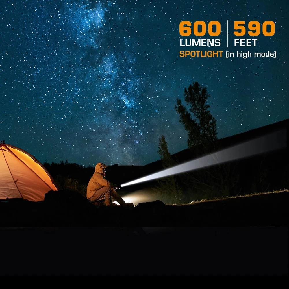 Shockingly Bright 600 Lumens&Long-Lasting: The flashlight emits a maximum output up to 600 lumens that will flood the length of one football field with a maximum beam distance of 590 feet. Providing long-lasting runtime up to 75 hours(low mode)of constant brightness by 3C Alkaline batteries Zoomable & 4 Light Modes: This handheld flashlight has 4 lighting modes: High/Medium/Low/Strobe. You can stretch the head of the flashlight to adjust the focus, and freely choose the spotlight for remote viewing and the floodlight for large-area lighting. It is ideal for camping, hiking, climbing, running, night walking, emergencies, or general household use. Durable Construction & High-Performance Lamp Beads: The biggest highlight of our flashlight---Equipped with P8 lamp beads, high-power LEDs with high performance, superior robustness and long lifetime, high luminous efficiency, and it has good heat dissipation. Suitable for outdoor, camping, and adventure, as well as for home, and garden lighting. Virtually Indestructible: The aluminum body with a knurled finish gives it exceptional heavy-duty characteristics and dust resistance. With an IPX4 waterproof and impact resistance tested from 4-15/16 FT (1.5 meters), it makes this the perfect outdoor professional flashlight. Specification: Weight: 225g, Length: 8.4"/9". Package includes: 1* LED Flashlight with lanyard ; 3* C Batteries; 1* User guide.