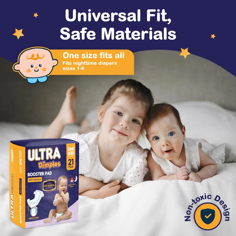 OUR MOST ABSORBENT BOOSTER PAD EVER: No more leaks, no more overflow, say goodbye to midnight sheet changing. The ULTRA Dimples Booster pads are designed to absorb even the heaviest of wetter's. One size fits all, Nighttime diapers sizes 1,2,3,4, 5, 6 and more, the ULTRA Dimples has you covered. Use in Disposable diapers or as a cloth diaper insert. SIGNIFIGANTLY INCREASE YOUR DIAPERS ABSORBANCY CAPACITY: Stop nightime leaks. The ULTRA DIMPLES Booster Pad wicks moisture from your baby's delicate skin keeping your little angel dry and comfortable. The pad locks in fluid and prevents leaks. ADHESIVE STRIP KEEPS PAD IN PLACE - SIMPLE TO USE: Simply peel off adhesive strip and secure to the inside of the baby diaper to turn any night time diapers in to a super diapers. SLIM DRY TECHNOLOGY: The best overnight diapers achieve 3x the absorbency with 1/2 the bulk for a comfortable fitting diaper liner. Level up traditional diapers with our Ultra absorbent pads for baby newborns and toddlers NO MORE LEAKS! ONE SIZE FITS ALL - WORKS WITH ALL SIZE DIAPERS - LATEX AND CHLORINE FREE: Diaper liners perfect as an overnight diaper, long car trips or any overactive bladder. Designed by parents trusted by parents.