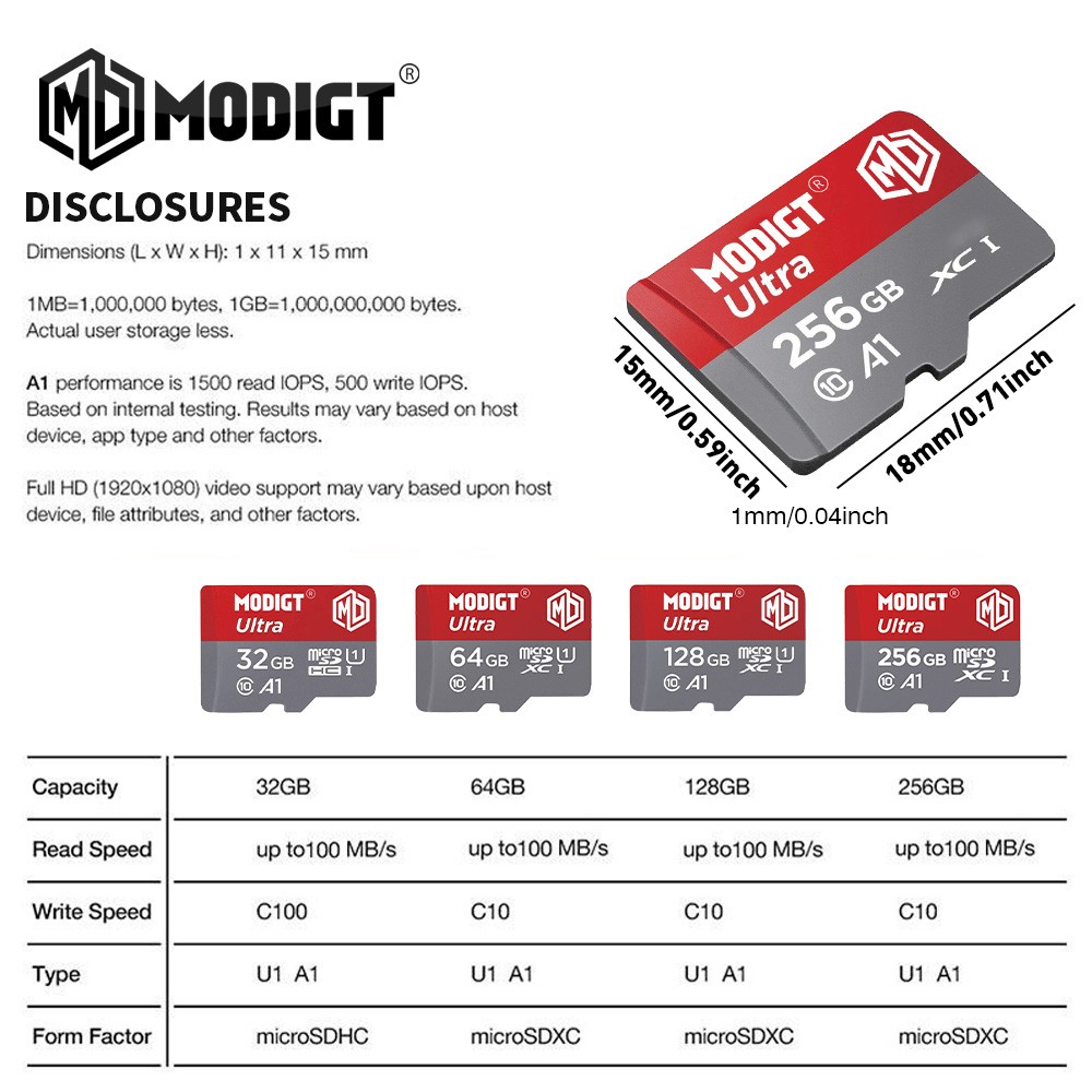 Preface Choose our ultra high speed micro SD memory card to bring unlimited convenience to your device. You no longer need to consider whether to clean files or uninstall games. We will solve this problem very well. Our SD card has undergone countless tests and optimizations, making it effortless to capture animal moments quickly or take high-definition photos and videos. Technical Specifications: Migomap “MGT Official Flagship Store” Selected Parts Ultra Micro SD Memory Card High-capacity Best Fortablets/Nintendo Switch LOT Preface Choose our ultra high speed micro SD memory card to bring unlimited convenience to your device. You no longer need to consider whether to clean files or uninstall games. We will solve this problem very well. Our SD card has undergone countless tests and optimizations, making it effortless to capture animal moments quickly or take high-definition photos and videos. Technical Specifications: Working temperature: 0-70°C Storage temperature: -20°C-85°C Capacity: 32G/64G/128G/256G/512G Speed Class: 120MB/S, 140MB/S, 150MB/S, 150MB/S File System: FAT32 (16GB to 32GB) / exFAT (64GB to 512GB) Dimensions: 0.59 x 0.043 x 0.03(14.99 x 10.92 x 1.02mm) Warranty: 2-Years - Micro High-Speed SD Card - Expand Your Device Memory ( Your best choice ) - 1. View detailed information of storage card Storage Capacity Photos Music Audiobook MPEG1 Video E-Mail (1.3MP) (3MP) (5MP) MP3 Songs MP3 Mins. 35K Size Aprox. 16GB 25,152 14,464 9,520 3,040 1,632 1,088 348,256 32GB 50,304 28,928 19,040 6,080 3,264 2,176 696,512 64GB 100,608 57,856 38,080 12,160 6,528? 4,352? 1,393,024? 128GB 201,216 115,712 76,160 24,320 13,056 8,704 2,786,04 Package includes: SD Card with Adapter (Choose From Drop Down) When selecting the number of products, please pay attention to carefully checking the quantity of each option's products. (1pc/2pcs/4pcs/5pcs/10pcs) About this item : Massive Storage, Available in 32G/64G/128G/256G/512G capacities to store thousands of photos/videos. Reliable Durability, Water-resistant, shock-proof, and temperature resistant (operates from -25°C to 85°C). Plug & Play, Simple installation with no lag - works instantly upon insertion. Universal Compatibility, Works with Android phones, Nintendo Switch, tablets, laptops, DSLR cameras, drones, and more. High-Speed Performance, High reading speed means you will be able to ignore lag issues - perfect for 4K video recording and burst mode photography. ▸ A1 rated for faster mobile app performance. Capture Full HD Video on Your Smartphone or Tablet! ✧ You'll never have to choose what to keep and what to delete on your Smartphone or tablet, The card lets you shoot and store more photos and videos without running out of space. You'll have enough room for thousands of high-resolution photos or up to 24 hours of HD video. ✧ Our high-performance SD card is designed for use with smartphones, gaming consoles, tablets, computers, and cameras. With large storage capacity, fast data transfer, and instant access, it ensures smooth performance with no lag or delays when installed in your devices. Perfect For: Expanding smartphone storage Gaming console memory Professional photography Dash cams & surveillance systems Storing music/movies Please note that the purchased package also includes a memory card adapter, so there is no need to worry about it being unusable. We will maximize your protection. Why Choose Our SD Card? Factory certified authentic memory Rigorously tested for quality assurance 100% performance guaranteed Reliable customer support Years of production experience, millions of experimental results, and continuous research and development to improve product performance. MODIGT SD Cards have the most advanced new technology support, bringing unlimited convenience to your life. Note All units are 100% authentic and come in original retail packaging. Please check your device's maximum supported capacity before ordering. Customer service is always online except for holidays. If you have any questions, please contact us. Thank you for visiting this item, Wishing you a happy life ~ Item Specifics Brand MODIGT Format MicroSD Storage Capacity (1) 32G, 64G, 128G, 256G, 512G Speed Class Class 10 Series Ultra Type SD Card Features Compact size, easy to carry Features 2 Good compatibility and no latency Features 3 Affordable price and fast transmission speed Features 4 Widely applicable and with large storage capacity Features 5 Fully supports high-definition images and videos Features 6 Waterproof, heat-resistant, cold resistant, scratch resistant Application 1 Smartphones, digital cameras, tablets Application 2 Portable music player, flash memory drive Application 3 Drones, dash cams, security cameras, GPS devices Read Speed 1 32G -- 120MB/S Read Speed 2 64G -- 140MB/S Read Speed 3 128G -- 140MB/S Read Speed 4 256G -- 150MB/S Read Speed 5 512G -- 150MB/S Manufacturer Warranty 2 Years Payment 1. It will be much appreciated that you finish your payment asap or it will make UPI (unpaid item case) on your account leading to be suspended or restricted by eBay when those UPI cases carry over to certain amount. 2. Any problems please contact us for more details. Shipping 1. All items will be shipped to buyer's ebay address. 2. All items will be shipped within 24-48 working hours upon receipt of payment, and multiple items will be combined shipping. 3. In most cases, delivery takes around 3-5 business days, it's highly depended on the efficiency of the shpping carrier. If your item doesn't arrive on time, please contact us immediately for further assistance. Please note there is no local pickup service available. Returns If you are not 100% satisfied with your purchase, you can return the product and get a full refund or exchange the product for another one. Please Note: Please write us a message before your return, otherwise we will not accept the package. Any product you return must be in the same condition you received it and in the or