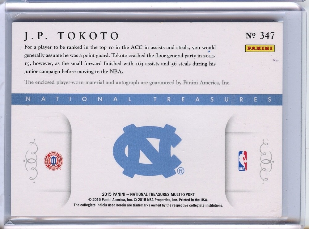 The product is an autographed sports trading card featuring JP Tokoto from the 2015 Panini National Treasures set. This rare card includes a patch from Tokoto's time with the North Carolina Tar Heels, making it a memorabilia piece. With a limited production of only 5 cards, this Rookie Patch Autograph (RPA) is serial numbered 4/5, adding to its collectible value for fans of Tokoto and UNC basketball.