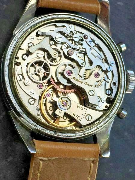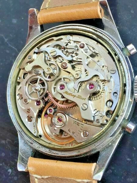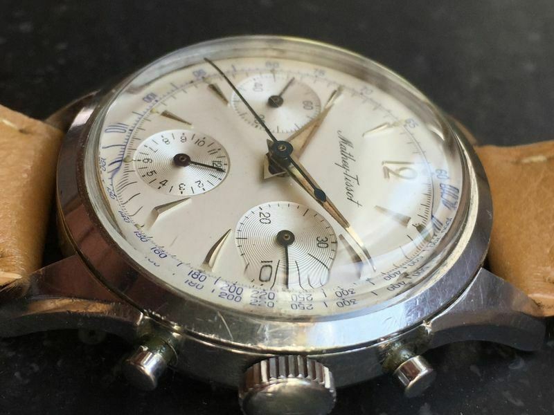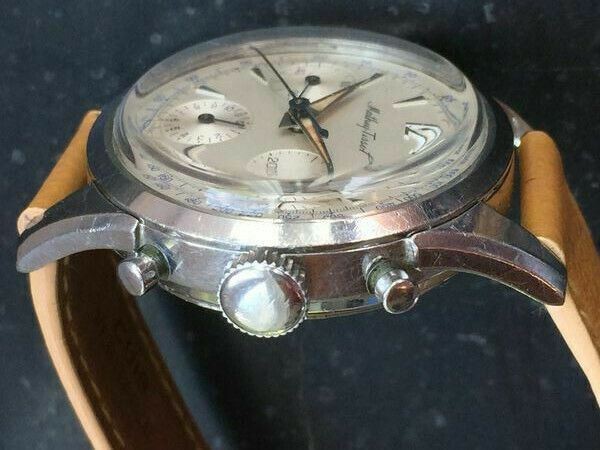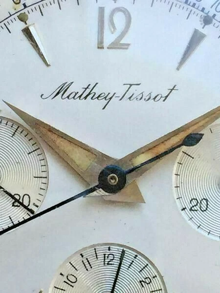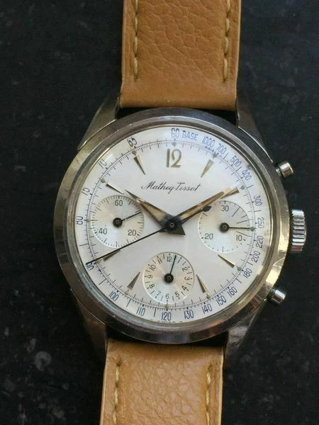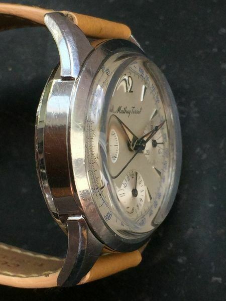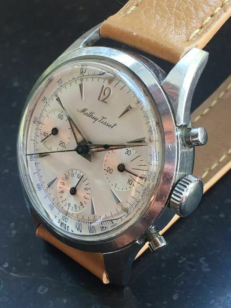 all wath makes a vintage watch expensive and real valuable: 1. - a Valjoux 72 movement, same as the first KHeuer Carrera and the early PRolex Daytona 2.- an high grade screw back case with round pushers, same as the PRolex pre-Daytona and the rare ealy KHeuer Valoux 72 chronographs from far away, this chronograph looks very much like a PRolex pre-Daytona, which incidentally also houses the workhorse Valjoux 72. Yet, Mathey Tissot made some small tweaks in the dial that increased the overall legibility, while retaining the attractive blue external track. Similarly, its case shape is slightly different; closer to a PRolex Oyster case given the lugs. It is the type of 1960s chronograph that just works Manual / Steel / Good Condition / 1 Year Warranty Brand : Mathey Tissot Reference : Chronograph circa 1960 Diameter : 35 mm without crown Movement : Manual, caliber Valjoux 72 Column Wheel , works perfect Case Material : Very good condition, all stainless steel case Bracelet material: New not original leather band, watch + band = 22cm Glass : Perfect Dial : all original condition, light signs Water resistance : We can´t guarantee Condition : Top condition, 8 / 9 about 10 condition for this age. Watch has 1 year Warranty, insured shipping Listing and template services provided by inkFrog