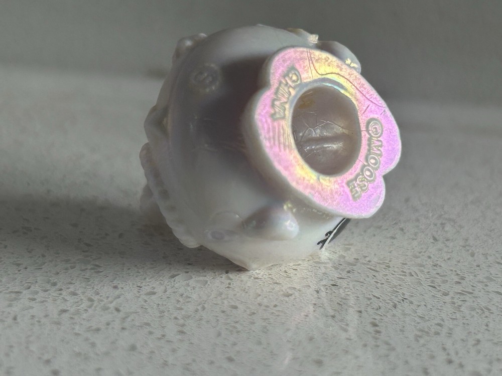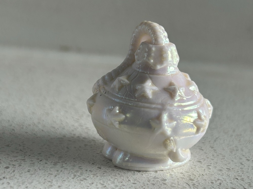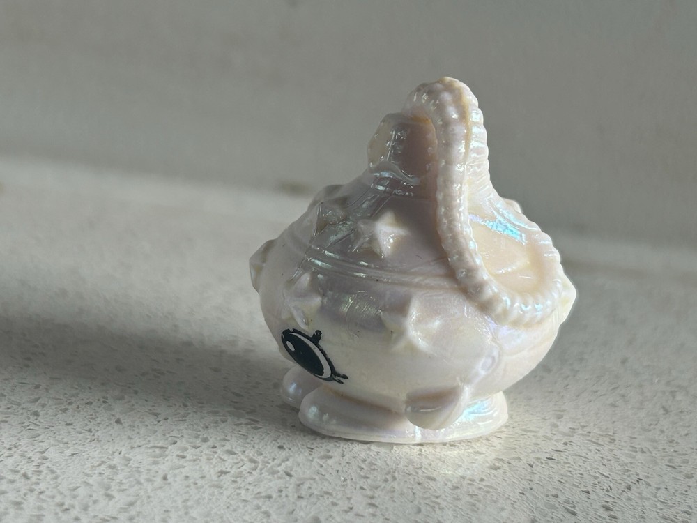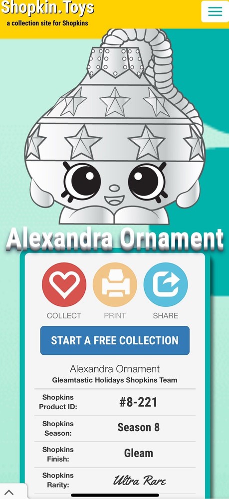 Alexandra Ornament season 8 #8–221 Gleamtastic Holidays Collection - Ultra Rare Excellent condition Alexandra Ornament is a shimmery Pearl coloured Christmas ornament. She has a pear shape and a string coming out of the top of her head that is sealed with a cap. She has stars on her body in two straight lines.