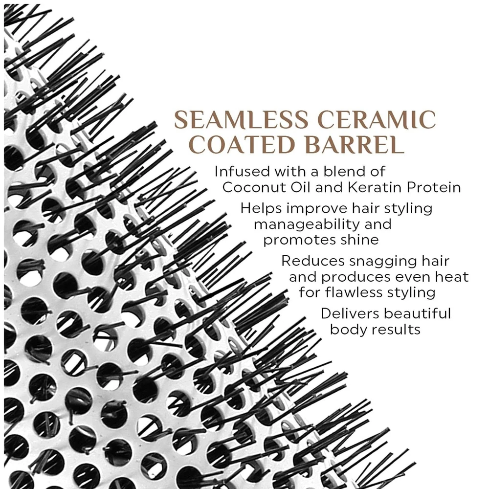 Voluminous Styling: Effortlessly achieve beautiful body, luscious curls, and salon-quality volume with the Ultra Smooth Coconut Thermal Hair Brush, specially designed for blow-drying and styling all hair types with ease. Infused Barrel: The seamless ceramic barrel is infused with Coconut Oil and Keratin Protein, which work together to enhance shine, boost luster, and promote healthier-looking, more manageable hair every day. Anti-Static Bristles: Featuring heat-resistant, anti-static Nylon bristles, this brush minimizes frizz, smooths hair strands, and ensures a polished finish during styling. Frizz-Free Shine: Reduce frizz and enhance shine with the powerful keratin infusion, which adds anti-frizz benefits, leaving your hair looking sleek, smooth, and radiant after every use. Ergonomic Handle: The rubberized, textured handle provides a secure and comfortable grip, allowing for effortless control and easy maneuverability, even during extended styling sessions.