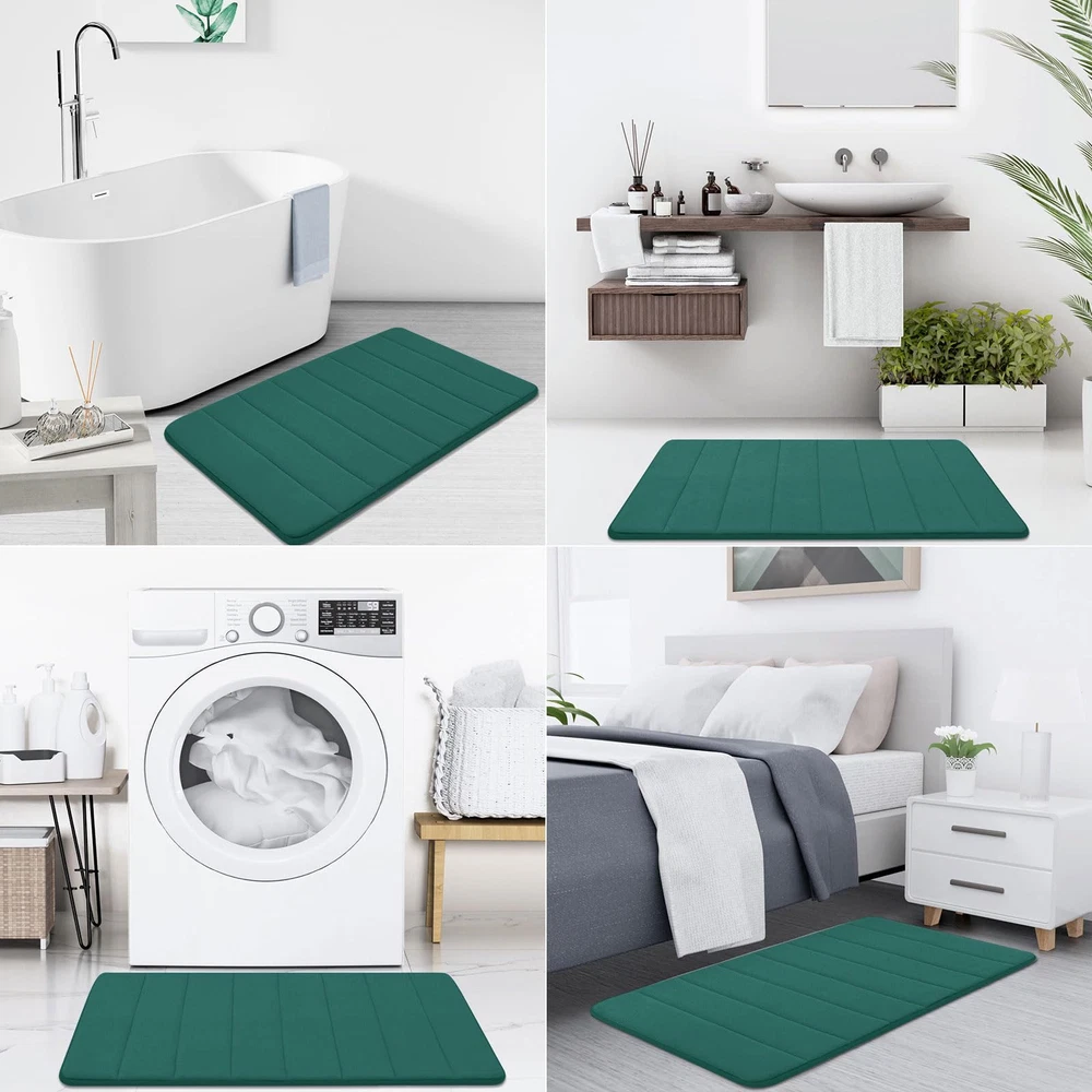 SOFT & COMFORTABLE: Bath mats are filled with polyurethane memory foam and the microfiber velvet outer material, soft and cozy, skin-friendly, relieve pressure and fatigue on your feet NON-SLIP PVC BACKING: Bathroom mats feature a non-slip mesh back to prevent the mat from shifting and skidding, and the rubber back prevents water from seeping to the soft surface. WARNING: Place mat on CLEAN DRY SMOOTH FLOOR only. Water under bath mats can cause it to slip. Keep bottom of mat dry. Before using bath carpet, test with foot to ensure it doesn't move WATER-ABSORBENT: Bath rugs are treated with memory foam to absorb water and dry quickly, keeping your bathroom away from water, and keep clean every day EASY CLEANING: Machine wash in cold water. Do not use chlorine or bleach. Tumble dry on low heat or lay to air dry, the color will not fade with continual uses. Please measure the size before purchasing these mats Remove the Crease: Our bath mat is packaged using our innovative rolled packaging method. To effectively remove the creases, please follow these steps: 1. Place a damp towel over the folded sections of the bath mat; 2. Gently press and move the iron across the mat periodically. This process should significantly reduce the creases, Once the creases are minimized, the bath mat can be placed anywhere in the bathroom