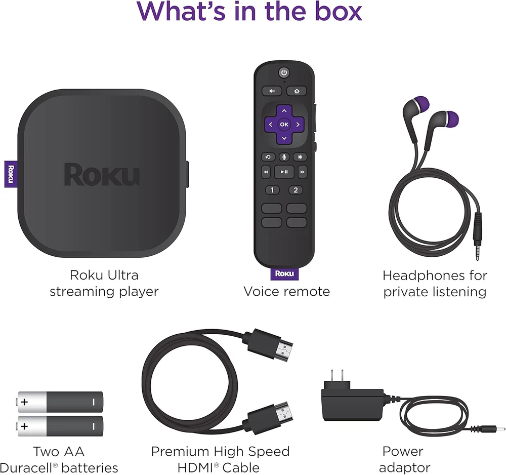 Outrageously powerful: Enjoy a lightning-fast interface and channels like Sling, Hulu, Netflix, and Prime Video that launch in a snap on the fastest, most powerful Roku player ever Our best Wi-Fi: Enjoy fast, smooth TV streaming in any room in the house with our best Wi-Fi or choose to wire up over Ethernet Cinematic streaming: Roku Ultra is the centerpiece of your home theater with spectacular 4K and Dolby Vision picture plus immersive Dolby Atmos sound Find your lost remote: Simply press the button on your streaming device and your Roku remote will play a sound No more juggling remotes: Power up your TV, adjust the volume, and control your streaming device with one Roku voice remote Roku Ultra is the ultimate streaming player. With a lightning-fast interface and channels like Sling, Hulu, Netflix, Disney+, Prime Video, and HBO Max and that launch in a snap, it’s the fastest and most powerful Roku player ever. Stunningly sharp 4K picture brings out the rich detail in your entertainment with four times the resolution of HD. Watch in awe as colors pop off your screen with spectacular Dolby Vision® picture and immerse yourself in three-dimensional sound when you combine this Roku streaming device with Dolby Atmos® audio. A strong, steady Wi-Fi® connection is important for streaming the highest picture quality, especially in rooms farther from your router. That’s why we took our best Wi-Fi® in this Roku 4K device and boosted it for even more speed and range, so you can enjoy fast, smooth TV streaming anywhere in your home. Easily search across thousands of channels with your voice, power up your TV, enjoy private listening with included headphones, and set personal shortcuts for your favorite channels with the Roku Voice Remote. Upgrade your streaming with a massive selection of free, live, and premium TV, including Roku® Originals only on The Roku Channel. The customizable home screen puts your favorites front and center, so you can spend your time streaming—not scrolling. Setup is simple with everything you need in the box, including a Premium High Speed HDMI® Cable. Roku Ultra also works with popular voice assistants. Ask Alexa or Hey Google to launch channels, search for entertainment, control your streaming, and more. You can also control your TV using the Apple Home app or Siri on your Apple devices.