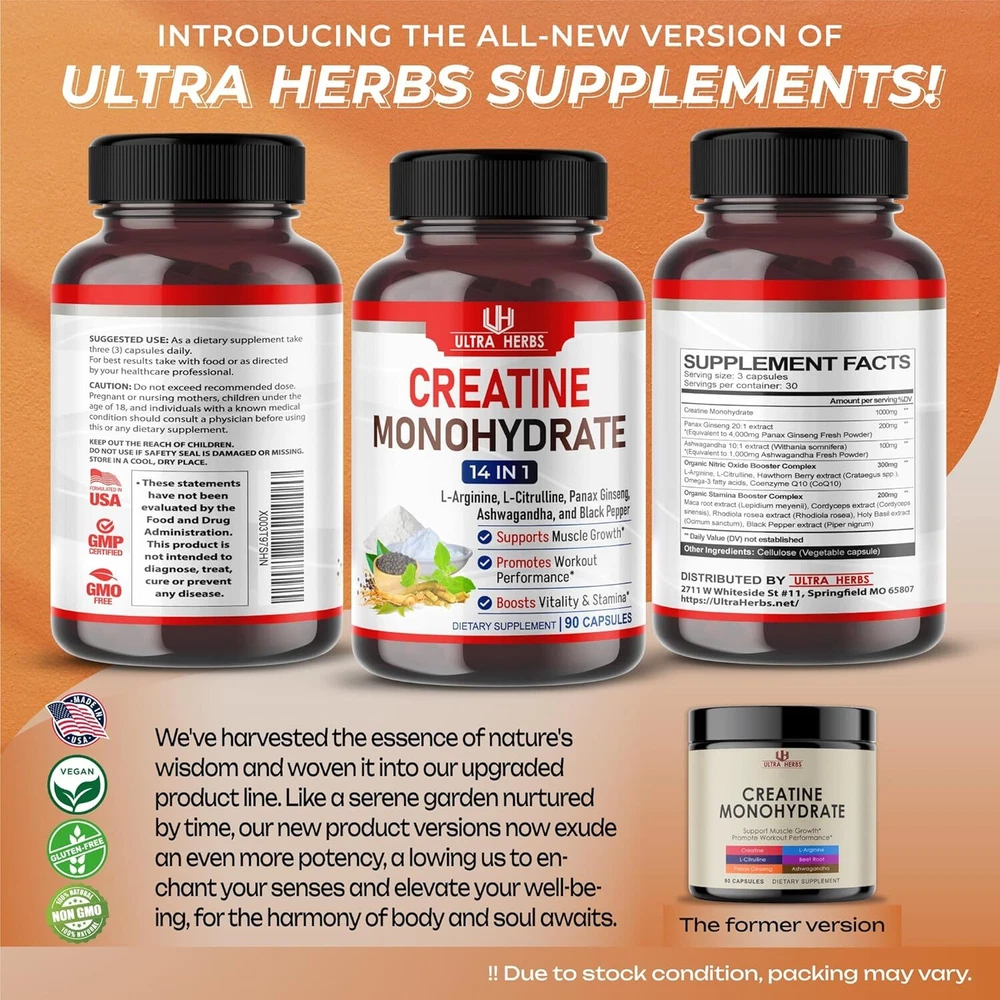 Ultra Creatine Pills 9800mg | Creatine Monohydrate Capsules Enhanced with L-Arginine, L Citrulline, Ginseng | Support Stamina, Energy & Muscle Growth | 90 Capsules Product Details Package Dimensions : 4.09 x 1.97 x 1.93 inches; 2.4 ounces Manufacturer : ULTRA HERBS Brand: ULTRA HERBS Unit Count: 90.00 Count Item Form: Capsule Product Benefits: Muscle Growth Age Range (Description): Adult Package Information: Bottle Number of Items: 1 Dosage Form: Capsule Material Feature: GMO Free SUPERIOR CONTENT: Each serving of Ultra Herbs Creatine Monohydrate is equivalent to an unprecedented level - 10500mg of raw powder. Don’t stop there, our supplement also boasts a highly concentrated 20:1 Creatine Monohydrate extract to maximize your benefits. Other brands in the market do not contain similar content; they only use fresh powder or less than 20:1 extract. With consistent use, the results you achieve with Creatine Monohydrate will leave you amazed. IMPROVE YOUR OVERALL HEALTH: Creatine Monohydrate Supplement offers a comprehensive solution for your total health, featuring a distinctive 14-IN-1 formula and a potent 10500mg per serving. Suitable for both men and women, it supports muscle growth, promotes workout performance and boosts vitality & stamina . By incorporating this supplement into your routine, you will notice a complete difference. Rest assured, this hassle-free and time-efficient addition won't disrupt your schedule. EFFICIENT FORMULA: 1 capsule of Ultra Herbs Creatine Monohydrate contains 14 natural ingredients, resulting in a highly concentrated formula. These powerful ingredients include Creatine Monohydrate, Panax Ginseng, Ashwagandha, 5 extracts of Organic Nitric Oxide Booster Complex and 5 extracts of Organic Stamina Booster Complex. Taking only three capsules every day is enough to experience the full advantages of this unique formulation.