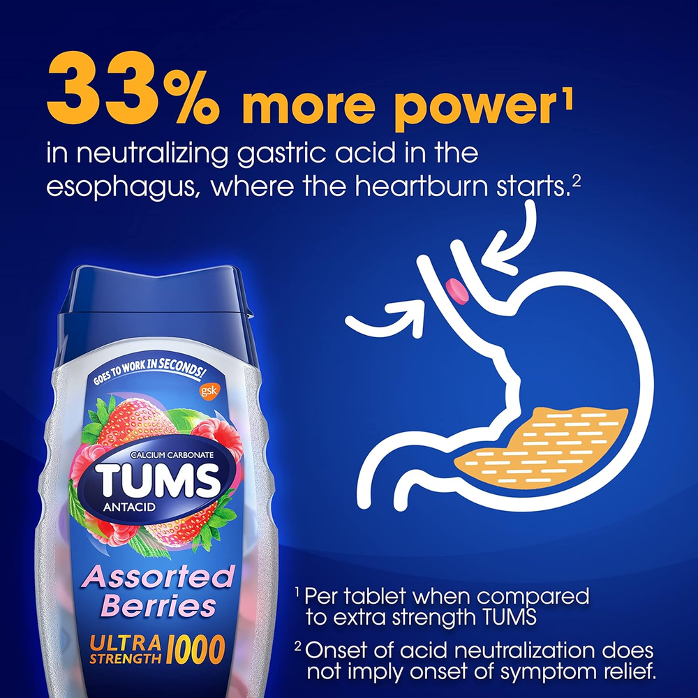 Contents: 1 bottle containing 72 TUMS Ultra Strength Chewable Antacid Tablets for Heartburn Relief and Acid Indigestion Relief in easy to take, delicious Assorted Berry flavors - Strawberry and Raspberry Multi-Symptom Relief: TUMS antacid tablets treat the four signs of heartburn: burning in the chest, acid indigestion, sour stomach and upset stomach associated with these symptoms Fast And Powerful Strength: Nothing works faster! This TUMS Assorted Berries 1000 mg antacid tablets go to work instantly by starting to neutralize acid on contact Gluten Free And Kosher: This heartburn medicine has the active ingredient 1000 mg calcium carbonate Number 1 Doctor Recommended: TUMS is the number 1 recommended adult antacid brand by doctors, pharmacists and OB-GYNs TUMS Ultra Strength Chewable Antacid Tablets go to work in seconds by starting to neutralize acid on contact to bring fast and powerful ultra strength, chewable heartburn relief. When symptoms occur, chew and swallow two to three ultra strength tablets, depending on the severity of your acid indigestion. Featuring the active ingredient calcium carbonate, these antacids provide heartburn, acid indigestion and sour stomach relief, as well as upset stomach relief associated with these symptoms. TUMS antacid tablets are the number 1 recommended adult antacid brand by doctors, pharmacists and OB-GYNs. As America's number 1 antacid and trusted as a heartburn medicine for 90 years, TUMS is fully supported with a satisfaction guarantee. These calcium carbonate tablets are gluten free and kosher. Packaged in a resealable bottle, this heartburn and acid indigestion relief medicine is convenient to keep in your car or office for whenever heartburn strikes. Choose TUMS Ultra Strength 1000 mg antacid tablets for fast acting heartburn relief, at home or on the go.