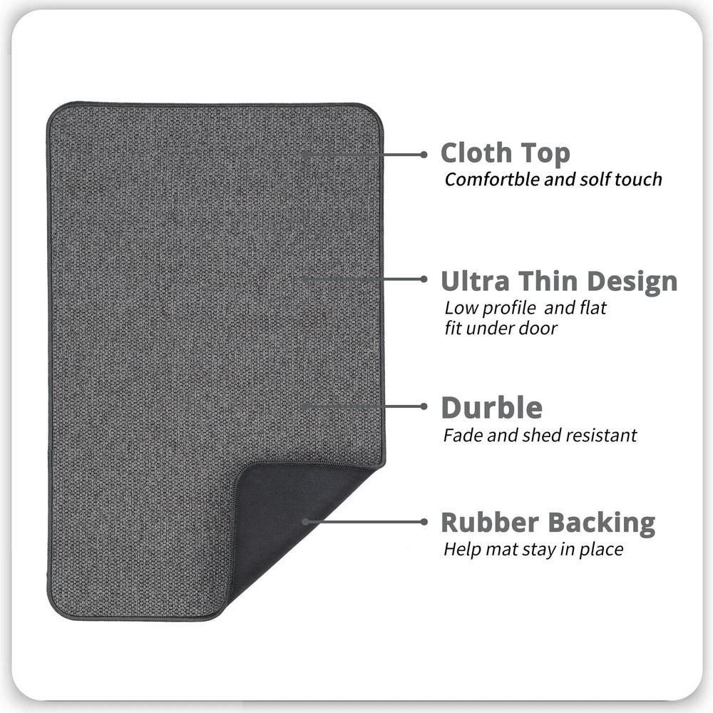 Thin anti-slip bathroom floor mat< br > Feature:< br > -Ultra thin fit under door< br > -Super absorbent & quick drying< br > -Machine washable< br > -Bathroom mat with rubber backing< br > Specification: Color:Beige/Grey/Blue< br > Size:17x27inch< br > Material:Terry cloth and rubber< br > Package: 1 x Bath Mat ULTRA THIN BATH MAT - If you are looking for a bath rug that can fit under the door, here it is. Our bathroom mat features a thin enough rubber backing at the bottom that can fit under the door. With a thickness as low as 0.2 inches, you can place the non-slip bath mat behind a door without being entangled with fluff upon closing the door. SUPER ABSORBENT QUICK DRYING BATHROOM RUG - The bathroom rug mat is made from terry cloth, one of cotton.This material can immediately dry your feet when you step on them, keep the water to stay on and in the mat and not spill over onto the floor,and prevent the floor from getting wet. BATHROOM RUGS WITH RUBBER BACKING - Wet tile floor makes slip and fell after you take a shower. For safety, you need a bath mat that doesn’t move around and has great traction. Our bathroom rugs with rubber backing, lay the anti-slip mat on the floor and keep you safe! EASY TO CLEAN - Bathroom rug mat are easy to clean and maintain. You can wash the thin bathroom mat by hand or by wash machine. It will never fade or crack after washing. Please note: machine wash with cold water and mild detergent (no chlorine or bleach), dry at low speed and temperatures. WIDE USE - Our bath mat is not only suitable for use in the bathroom but can also be used in various other areas of your home. Whether it's in the kitchen, laundry room, entryway, or any other high-traffic area,Its durable construction and non-slip rubber backing make it perfect for any space where you want to enhance safety and comfort.