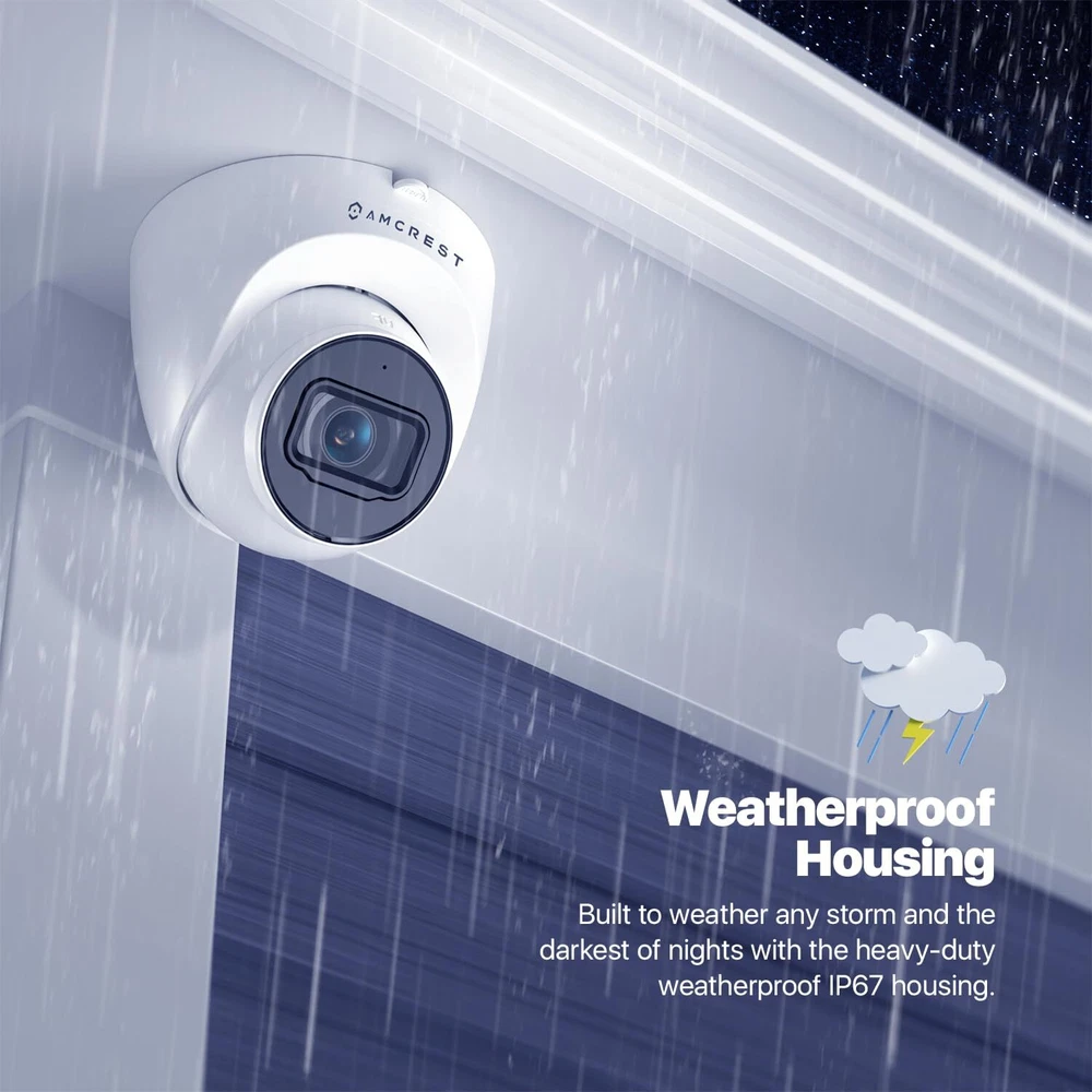 EXPERIENCE ULTRA HD 4K – Stunning ultra-high quality 4K (8-Megapixel / 3840x2160) resolution featuring enhanced low light capability utilizing the latest CMOS image sensor and chipset. Super-wide 105° viewing angle allows you to cover more ground and keep more of what matters to you safe. Power Over Ethernet (POE camera) for easy installation (POE Injector or Switch Required; Not Included, Sold Separately). SMARTER SECURITY – Receive motion alert notifications and review footage via your smartphone with the View app. Playback and record professionally on a PC using the Surveillance Pro for Windows and MAC (included) or Blue Iris Professional. Works with Cloud remote video storage, MicroSd Card (up to 256GB), NVRs, Synology and QNAP NAS, FTP, Pale Moon and Sea Monkey Browsers, IE, Safari, Firefox 49. 0 and Chrome with Web View Extension. DAY OR NIGHT, RAIN OR SHINE – Built to weather any storm and the darkest of nights, this Dome 4K PoE IP Turret Camera features a heavy-duty metal weatherproof IP67 housing as well as built-in IR LEDs and a CMOS 1/2.7” 8MP progressive CMOS image sensor to achieve unsurpassed low-light capability and night-vision up to 98 feet. Dual H.265/H.264 compression allows for maximum encryption with the latest technology as well as backwards compatibility with legacy platforms. SECURE CLOUD VIDEO BACKUP – The optional Cloud remote video storage subscription service allows you automatically store your videos off-site in a third-party location hosted and secured by AWS. This way if something happens to your local PC/NVR/SDcard/NAS, the footage will be safely recorded in a secure off-site location and accessible to you through a web-based Flash interface for PC (Chrome/Firefox/Safari/Edge) and AmcrestCloud smartphone app. SIMPLE, RELIABLE, SECURE - At , we want to ensure the safety of our customers, their loved ones, homes and businesses. You’ll receive a full 1-year US and Lifetime Support provided directly from . Built in microphone for one way audio. Compatible with the following Junction Boxes, ASIN: B07CB468HC, B07FK662Z5 & B07628JHXL.