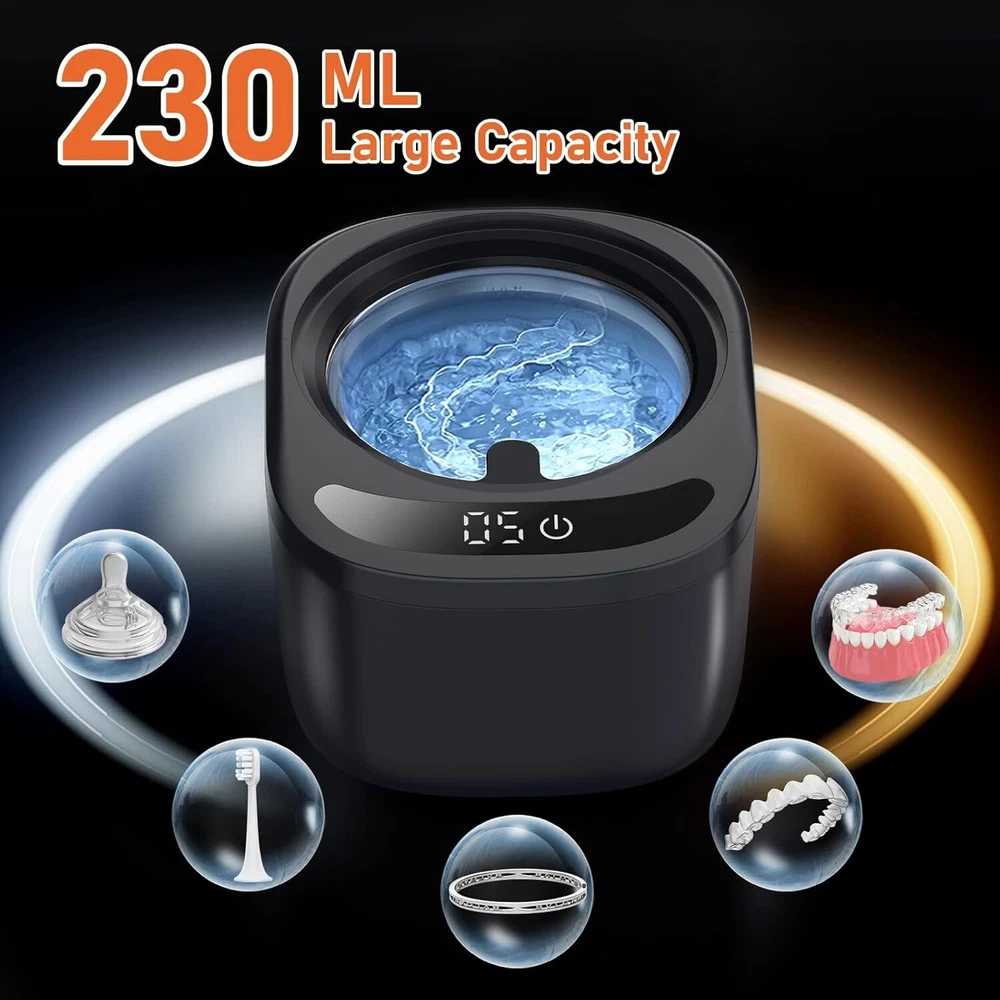 Advanced 45kHz Ultrasonic Cleaning Utilizing 42kHz-45kHz high-frequency waves, this ultrasonic retainer cleaner generates intense cavitation to safely and non-destructively dislodge stubborn stains from dental appliances like Dentures, Aligners, and Nightguards. The 230ml square-shaped tank fits full-size Mouth Guards while reaching hidden crevices in Braces and Jewelry Dual Sterilization UV+Ultrasonic High-intensity UV lamps work synergistically with ultrasonic waves, eliminating 99.9% dirty stuff and odors during cycles. Unlike basic retainer cleaner machines, our dual-action system ensures both physical debris removal and chemical-free disinfection for Dentures and Invisalign trays. Easy to use 3-Mode Operation Tailor cleaning intensity with 5/8/10-minute modes via one-touch control. The top-mounted digital timer displays real-time progress. For deep cleaning dental pods and complex dental appliance structures you can cycle through the 10-minute mode. Cleaning tablets can also be placed on demand. Convenient and Humanized Design The bottom of retainer cleaner machine is equipped with four pieces of non-slip rubber, which is easy to stabilize the tooth guard ultrasonic cleaner, effectively reduce the noise and safer to use. Also equipped with tweezers, convenient for you to put in and take out items. 230ML Capacity & Palm Size 15% larger than standard ultrasonic cleaner for retainers, yet compact for bathroom counters or suitcases. Matte finish resists fingerprints. Perfect for sanitizing multiple items: Braces, Nightguards, or earrings in one session.