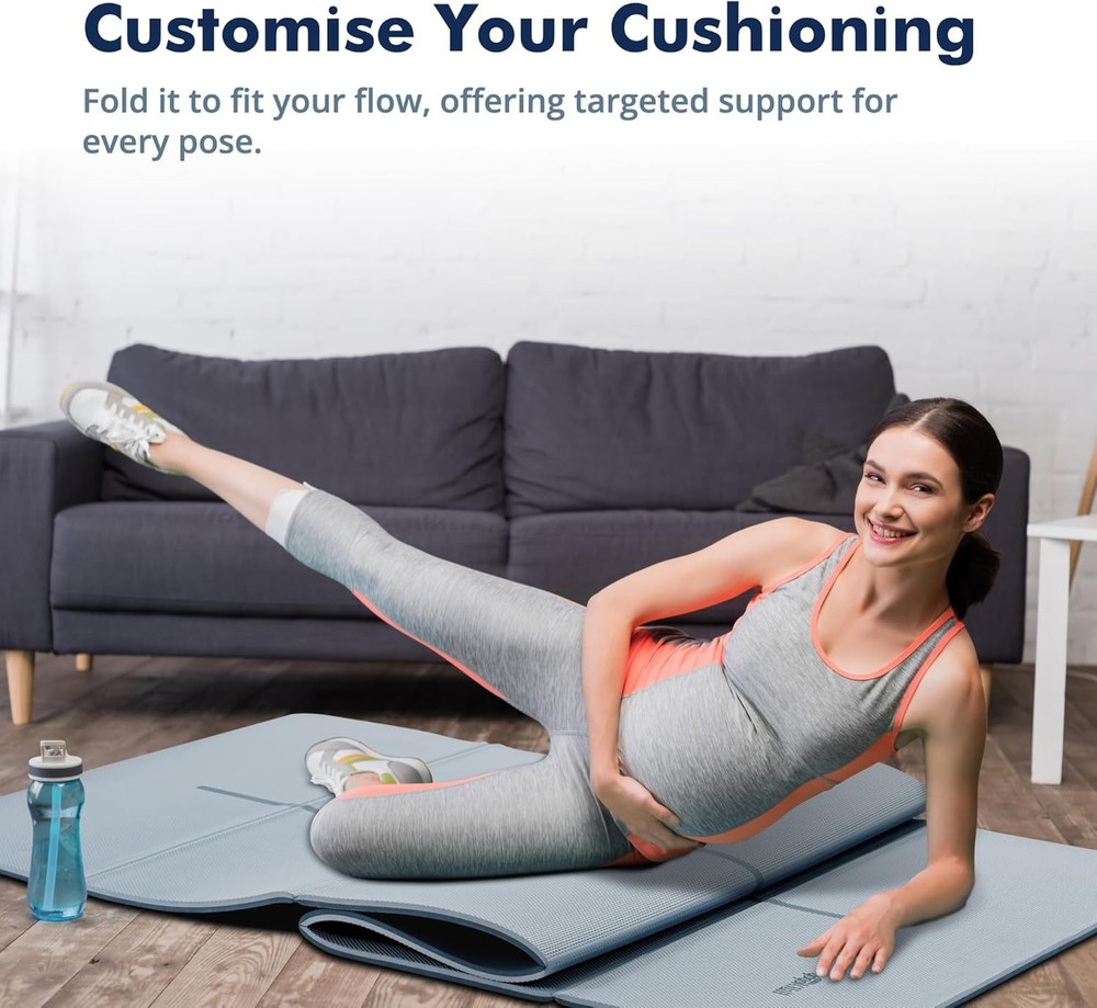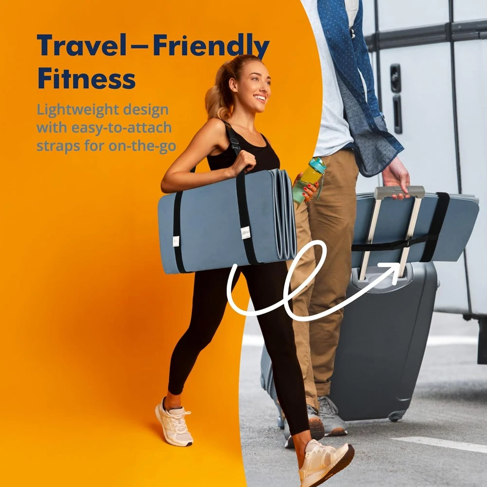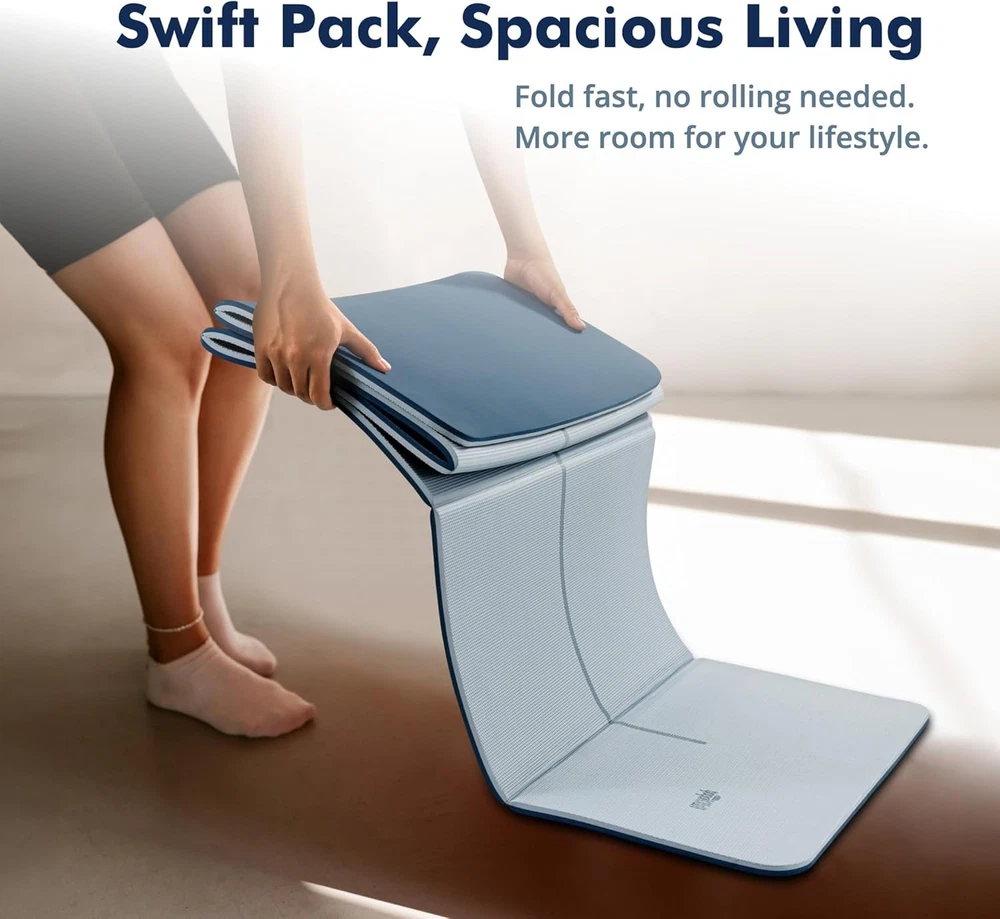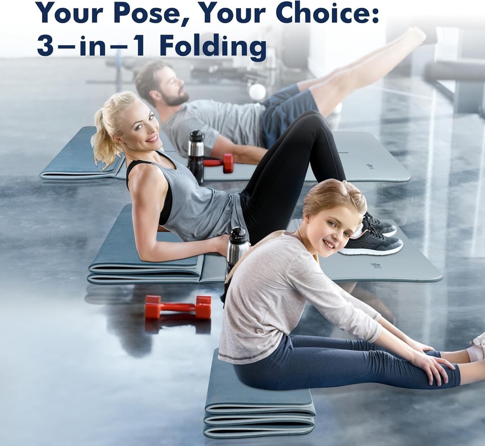 Just got this foldable yoga mat and it's a game-changer for my workouts! The perfect thickness when folded gives amazing cushioning for planks and ab exercises. Love how it packs up small for travel but feels so sturdy during use. The non-slip surface really works too - no more sliding around during intense sessions!