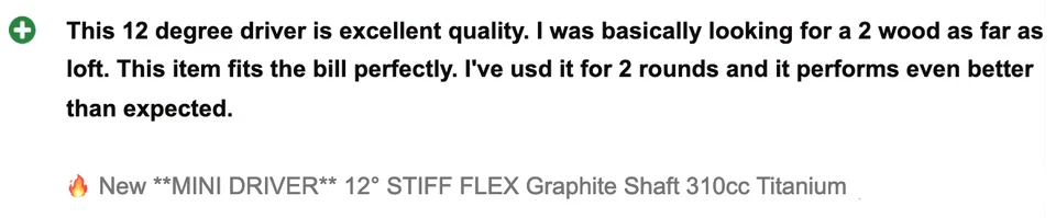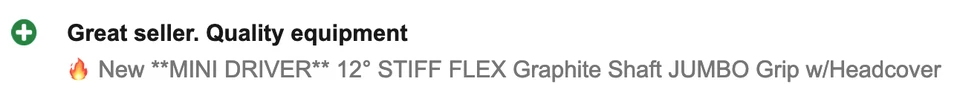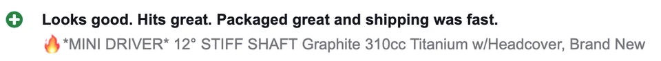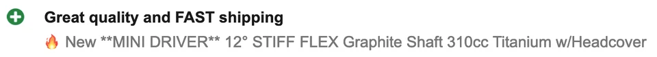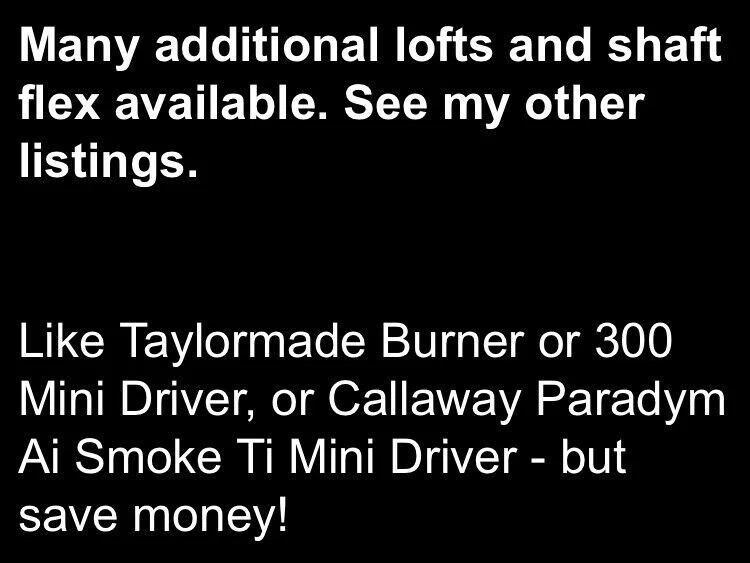 Normal Price: $229.99 SALE PRICE (limited time): $97.99 Fully assembled. Right Handed, 10.5 Degrees, TITANIUM, SENIOR, SENIORS ULTRA-LIGHT graphite shaft, JUMBO Grip. BRAND NEW in factory plastic with headcover . (Headcover may be black, black and blue, or brown "Dawg Pound" head cover, may be numbered 1, 3 , or X.) Headcover style requests may be available, feel free to message me. Many additional lofts and shaft flex available. See my other listings. Like Taylormade Burner or 300 Mini Driver, or Callaway Paradym Ai Smoke Ti Mini Driver - but save money! Buy with confidence - 100% positive feedback! Assembled in USA! Ships from USA! Please allow up to 7 business days for handling as items are custom made to order and we do this part time. (We try to ship much faster, often same or next day. Ships via FedEx Ground Economy, UPS Ground, or USPS Ground Advantage.) Thanks for your order! Buyer responsible for regular professional safety checks on equipment, including before first use. Buyer assumes all responsibility for safety of equipment.