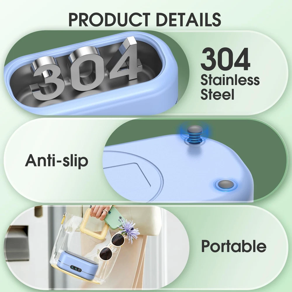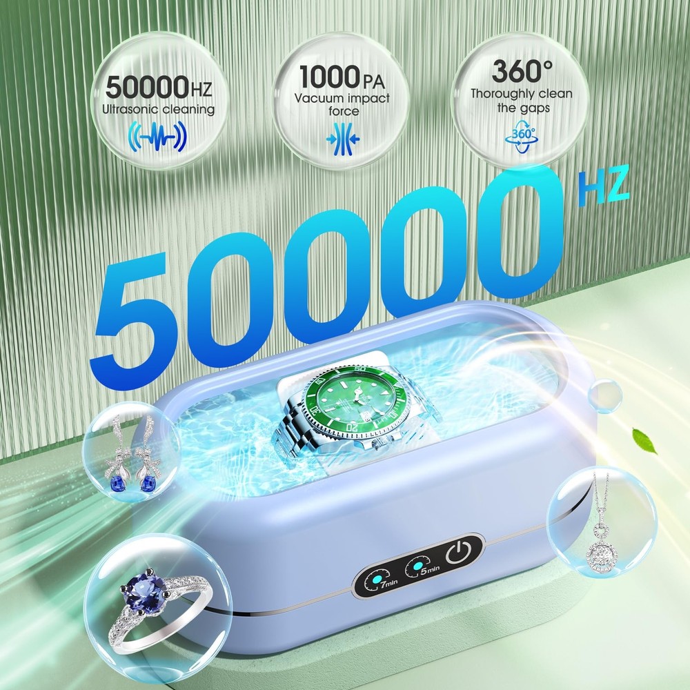 Professional Ultrasonic Jewelry Cleaner: Effortlessly cleans and restores the sparkle of jewelry, eyeglasses, watches, coins, and more by reaching into crevices and cavities to remove dirt and debris within minutes, all without causing damage. Note: This Jewelry Cleaner does not remove tarnish discoloration(using an ultrasonic cleaning solution is recommended) 2025 New Upgraded Dual-Core Ultrasonic Cleaner:This ultrasonic jewelry cleaner utilizes the latest dual-core ultrasonic frequency technology, generating millions of tiny bubbles to provide deep, non-invasive cleaning. It ensures thorough removal of contaminants like dirt, without damaging delicate surfaces. Durable and High-Performance Construction:Built with a corrosion-resistant 304-grade stainless steel tank and industrial-grade transducers, the ring cleaner guarantees durability, stability, and enhanced cleaning performance. The tank's seamless design prevents leaks and ensures extended service life. Versatile Applications: Emphasize the jewelry cleaner ultrasonic machine’s versatility for cleaning a wide range of items, including Jewelry,Glasses ,Ring, dental instruments, electronic parts, coins, and personal items, making it suitable for home, professional, or industrial use. Versatile Applications: Emphasize the jewelry cleaner ultrasonic machine’s versatility for cleaning a wide range of items, including Jewelry,Glasses ,Ring, dental instruments, electronic parts, coins, and personal items, making it suitable for home, professional, or industrial use. Package Contents: Ultrasonic jewelry cleaning machine*1, 1*watch stand, and 1*user manual. Ideal for cleaning jewelry, eyeglasses, watches, and other delicate items, it's a gift that combines utility with convenience for everyday use.