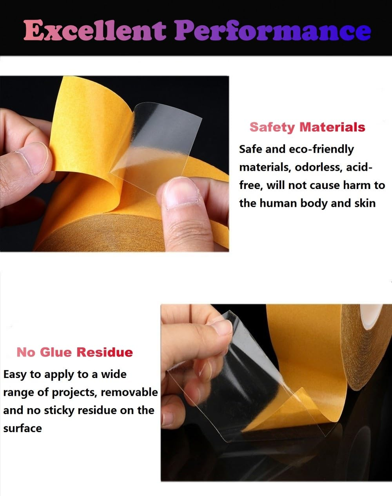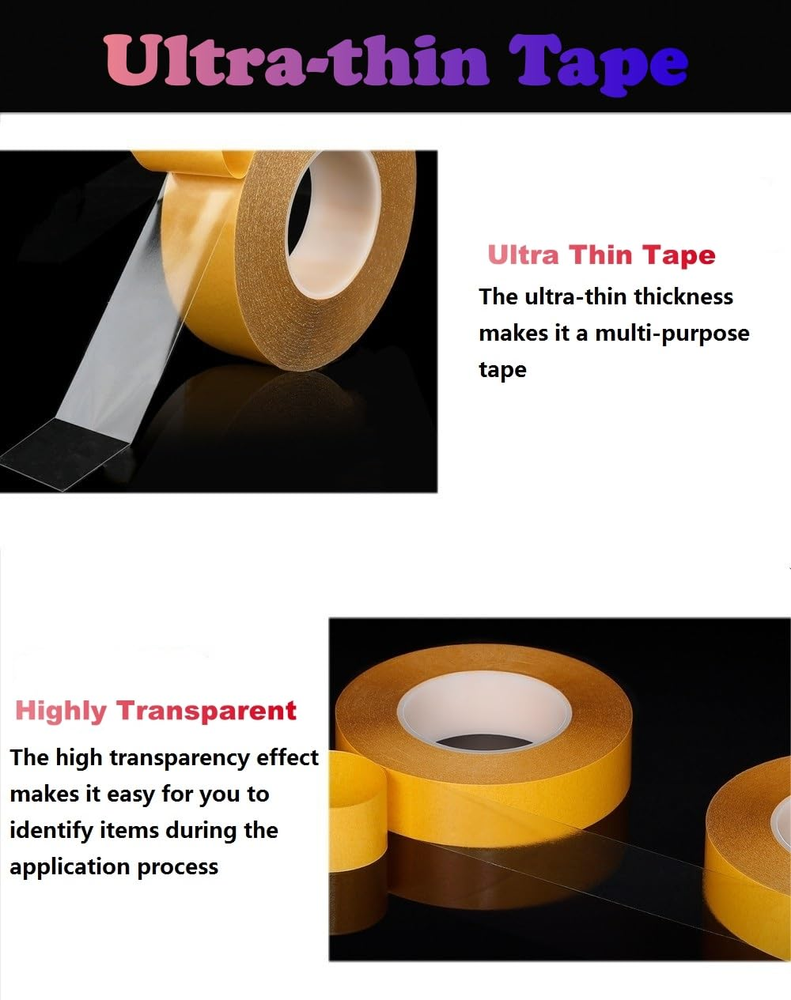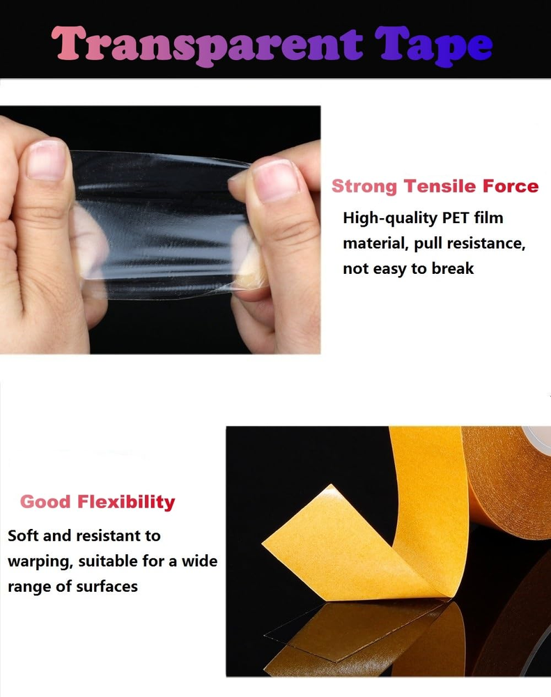 Industrial Grade: This heavy duty double-sided tape is made of high-quality PET material and acrylic pressure-sensitive adhesive. It is durable and long-lasting. The double stick tape is highly clear on both sides with a thin thickness and strong initial adhesion. It can easily bond two small objects securely together. After removing the 2-sided tape, it leaves no sticky residue on the surface. It is an excellent alternative to messy glue and is suitable for use in homes, offices, and schools. Excellent Performance: Double sided tape works perfectly in the temperature range of -10°C to 100°C, with strong adhesion, ultra thin, transparent, waterproof, insulation, heat resistant, shock absorption, tasteless, non-toxic, acid-free, removable and other properties. Suitable for most material surfaces such as wood, clothing, washi, glass, fiberglass mesh, leather, cloth fabric, foam, metal, aluminum, copper, plastic and more.Note: dual face tape is not suitable for rough&painted surfaces. Multi-purpose Tape: Thinner two sided tape is suitable for a variety of DIY art & crafts, sewing projects, paper crafting, walls decorations, model making, gift packing, fashion decorate, mounting rug, carpet fixing and anti-slip, as well as woodworking activities and cnc woodworker. It can also be used for women garment adjustments, securely attaching clothes to skin or underwear, and for cat training, preventing and protecting your furniture from being scratched by cats. Wide Application: The super thin double faced tape is a simple and practical tool that can be used in various situations to help us accomplish various daily tasks and creative projects. can be used for repair, install, fixed or pasting photos, poster, scrapbooking, cardstocks, heat embossing, glitter, cards, boxes, memorandum, dress, neckline, files sheet, stylish nail art, documents, stamps, signs, nameplates, colored duct, wall paper, grid sticker, LED strip lights, and more! Package Included: The whole roll of double sided tape is wide 0.5inch/1.27cm by long 66 feet/20m, transparent double-sided gum thick 0.1mm/ 3.94 mil, not including the thickness of the backing paper. Note: Because the double way tape is very thin, the yellow backing paper may sometimes be difficult to peel off when first used, to ensure easy use every time, please keep the yellow backing paper of the tape longer than the adhesive. Product Description Ultra-thin and Highly Transparent No Residual Glue After Removal Soft and Stretchable Odorless and Acid-free Waterproof and Moisture-proof Heat Resistance Essential for Daily Life Can be used to temporarily repair broken items and paste wall decoration items such as posters, photos, wallpaper, graphics and other small decorations. Office & School Supplies Can be used for diy arts & crafts, model making, gift wrapping and other creative projects such as scrapbooking, origami, cardstocks, heat embossing, stamps and more. Carpet No More Sliding Used to secure carpets or MATS to prevent the carpet from sliding on the floor, eliminating potential hazards and providing maximum safety for family members Keep Clothes Steady Can be used for clothing adjustments, such as quickly pasting clothing, secure plunging necklines and dresses, eliminate blouse gaps, hide bra straps, fake a hem, and more. Behavior Correction for Cats Can be used to train cats to develop good scratching habits, preventing them from scratches and damaging specific areas such as furniture, walls, door frames, or floors. Designed for Woodworking Can be used for woodworker activities such as wood temporary fixation, splicing, routing, anchoring, CNC machine cutting, marking, edge protection, and other carpenter projects.