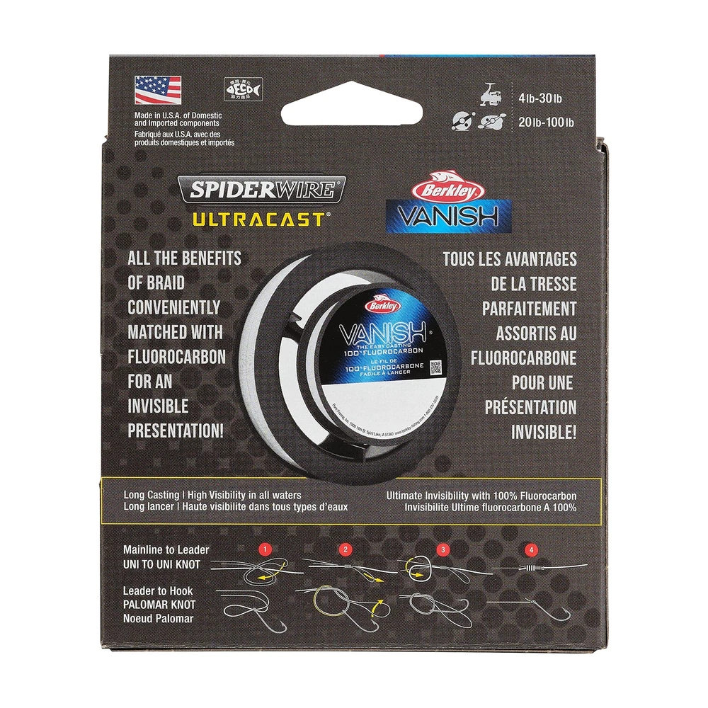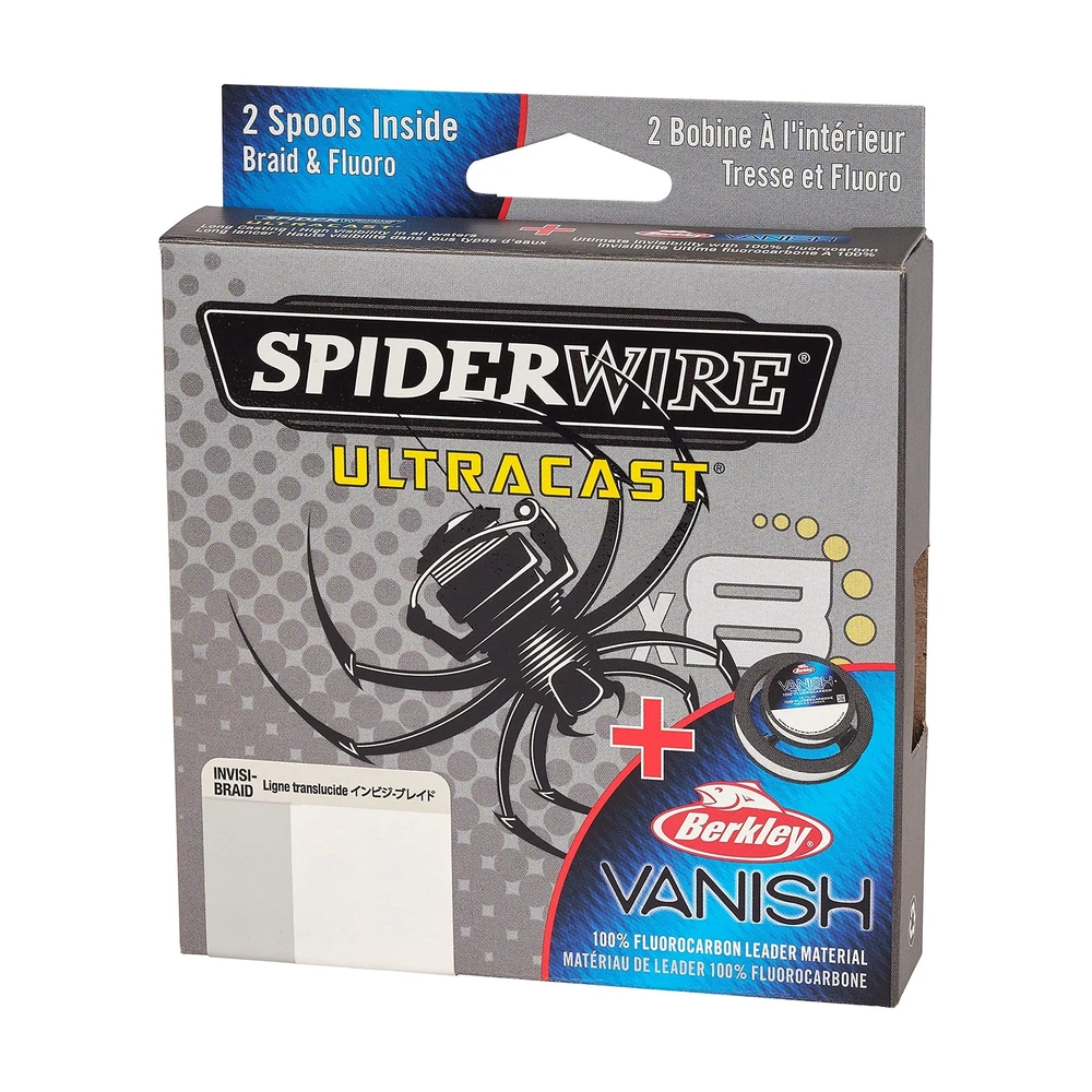 All the benefits of braided fishing line conveniently matched with fluorocarbon for an invisible presentation! Ultracast Braid paired with Berkley Vanish Fluorocarbon offers strength and toughness for all fishing applications with the invisibility near the bait triggering more strikes. This dual spool pack offers ultimate casting distance, strength, low visibility, and incredible reliability in one. Suitable for saltwater and freshwater marine environments where stealth, durability, and reliability is key to your success. Throughout the years, has become the cutting-edge fishing line of choice for aggressive anglers who demand the most out of their gear. Our fishing line takes you where the fish are and makes sure you bring them home; with , nothing gets away. ULTRACAST BRAID matched with Berkley Vanish Fluorocarbon leader combining the benefits of braided line plus invisible presentation for all fishing applications. Includes 2 spools in one box. ULTIMATE STRENGTH AND INVISIBILITY: The strength of braided fishing line paired with 100% fluorocarbon to provide invisibility near the bait to trigger more strikes. MAXIMUM ABRASION RESISTANCE: Ultracast long casting braid built to withstand unpredictable fishing environments and reduce line breakage. Fishing line break strength of 15lb | 6.8kg. Braid Length: 164yd | 150m. Translucent. SMOOTH, EFFORTLESS CASTING: Clear Berkley 100% fluorocarbon line is stronger, smoother, and more flexible for easy casting. Clear for near invisibility. HIGH SENSITIVITY, LOW STRETCH: Diameter of 0.005in | 0.12mm offers strong lure action you can feel. Superline Mono Equiv: 6lb. Available in a variety of sizes and colors, so nothing gets away.