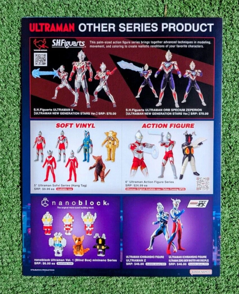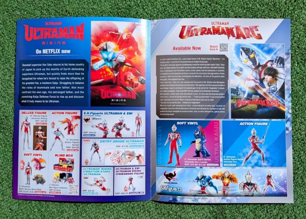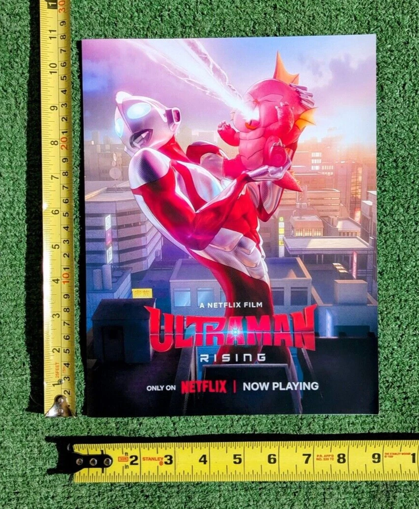 Excellent Used Condition (EUC)-no rips, no holes, and no tears. Ultraman Rising 8.5x11 Netflix Promo Booklet Bandai Namco Collectibles from the 2024 SDCC San Diego International Comic Con. Measures 8.5" x 11" when folded and opens to 17" folded out. The cover is the Ultraman Rising Netflix movie drawing. The handout unfolds to a summary of the Ultraman Rising movie promo with Ultraman merchandise teaser ads. The 2nd page features the Ultraman Arc summary and QR code with more merchandise alerts. The back cover features upcoming and available Ultraman merchandise. 5LS