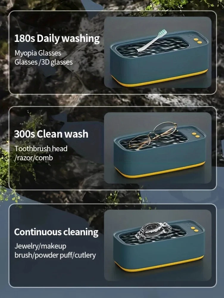 Ultrasonic Glasses Cleaning Machine 45KHZ Ultrasound Jewelry Cleaner Machine High Frequency Ultrasonic Cleaner Bath Feature: 1. Simple Operation: With just one button, you can easily turn the high-frequency vibration cleaner on or off, making it ideal for quick and hassle-free cleaning. 2. 360° Deep Cleaning: Our professional jewelry cleaner machine uses ultrasonic waves to quickly and easily remove dirt and grime from even the tiniest crevices without causing any damage, making your jewelry or other items sparkle like new. 3. High Frequency & Efficiency: With a powerful 45KHZ frequency and 98.99% cleaning efficiency, our cleaning machine can clean your items in just 3 seconds with a 500ml deep water tank. It operates quietly and reduces noise during cleaning, making it useful for multiple purposes. 4. Powerful Ultrasonic Waves: Our 360 degree cleaning machine uses strong ultrasonic waves to penetrate deep into your items and remove dirt, dust, and grime from every nook and cranny, giving your items a new lease of life. 5. Wide Range of Applications : Our jewelry eyeglasses watches cleaner is suitable for cleaning a wide range of items, including braces, combs, razors, jewelry, pacifiers, makeup tools, pens, metal cutlery, watch straps, nail clippers, toothbrushes, glasses, and more. Specification: Capacity: 301-500ml Power (W): 15w Certification: NONE Type: Ultrasonic Cleaner Model Number: Ultrasonic Cleaners Material: plastic electronic components Color: green pink white (optional) Dimensions: 22.5x10.5x7.5cm/8.85x4.13x2.95inch Rated voltage: 3.7V Rated power: 15W Ultrasonic frequency: 45KHZ Battery capacity: 250mAh Note: Due to the different monitor and light effect, the actual color of the item might be slightly different from the color showed on the pictures. Thank you! Please allow 1-2cm measuring deviation due to manual measurement. Include: 1 X Ultrasonic Cleaners 1 X Instruction Manual 1 X Charging Cable