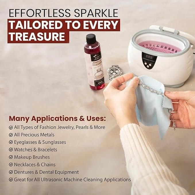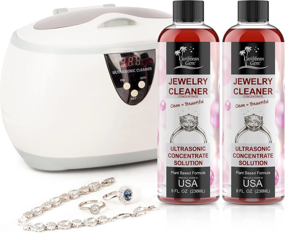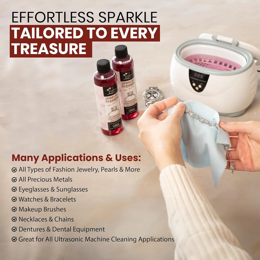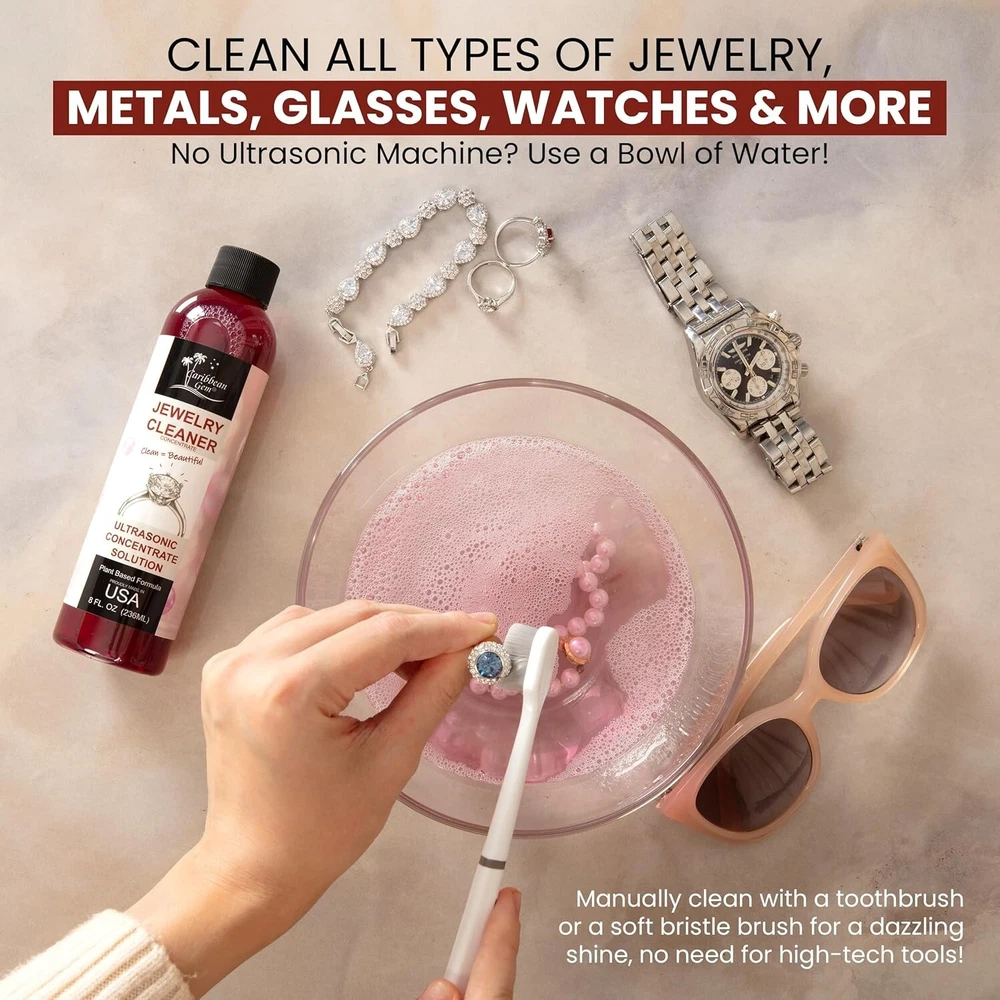 ๐ ๐๐๐ฃ๐ฎ๐ฏ๐๐ง๐๐ญ๐ข๐ง๐ ๐๐ฉ๐ ๐๐จ๐ซ ๐๐๐ฐ๐๐ฅ๐ซ๐ข๐๐ฌ - Rediscover the brilliance of your treasures with our USA-made ultrasonic jewelry cleaner liquid! With two 8 oz bottle, it delivers up to 37 machine refills for a long-lasting and cost-effective solution ๐๐๐ญ ๐๐๐๐๐ฒ ๐๐จ๐ซ ๐๐ก๐ข๐ง๐ข๐ง๐ ๐๐ซ๐ข๐ฅ๐ฅ๐ข๐๐ง๐๐ - Bathe your treasures in blissful luxury! From glittering gems to dazzling watches, our non-abrasive plant-based jewelry cleaning solution for ultrasonic cleaner is excellent for all your lovely jewels. ๐๐๐๐ข๐๐ข๐๐ง๐ญ ๐๐ฉ๐๐ซ๐ค๐ฅ๐๐ฌ - Simply pour one cap full of our ultrasonic cleaning solution per 20 ounces of water to turn your ultrasonic machine into a basin of sparkling elixir. One basin last for multiple cleanings. For non-machine use, a soft brush works wonders. ๐ ๐๐๐ซ๐ข๐๐๐๐๐ง ๐๐จ๐ฎ๐๐ก - Our ultrasonic jewelry cleaning solution is infused with Caribbean essence to bring you a touch of exotic delight. The notes of banana and coconut oil create a hygienic oasis, removing dirt and preventing the growth of harmful microorganisms. ๐๐ข๐ฆ๐ฉ๐ฅ๐ ๐๐ญ๐๐ฉ๐ฌ ๐ญ๐จ ๐๐ฎ๐ฌ๐ญ๐ซ๐จ๐ฎ๐ฌ ๐๐ก๐ข๐ง๐๐ฌ - The jewelry & ring cleaner solution comes with crystal-clear instructions, ensuring you can easily and efficiently apply our solution. It might not be magic, but it sure cleans like it!
