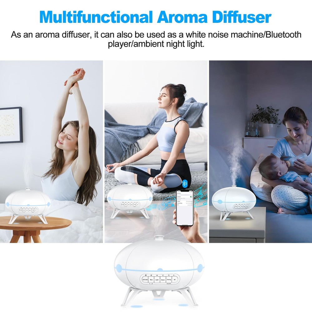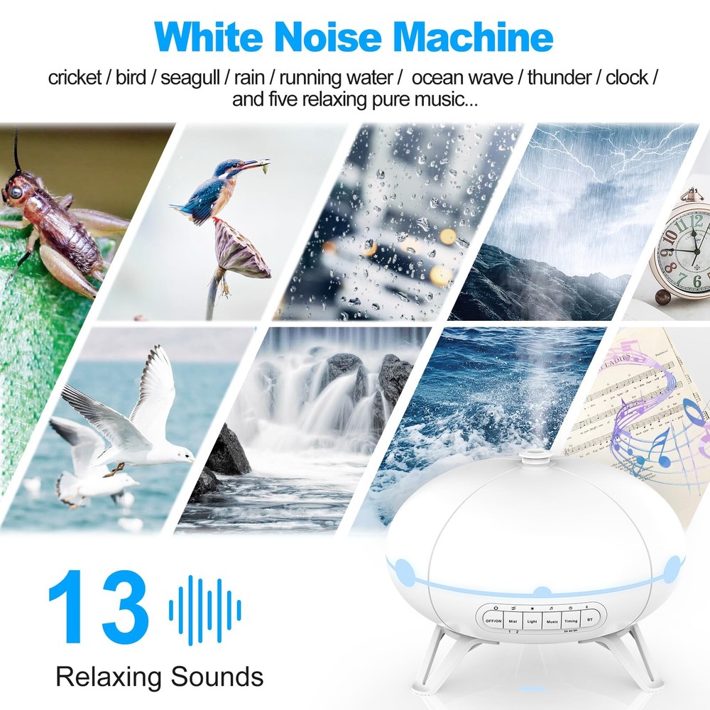 Use our 5-in-1 multifunctional aromatherapy humidifier with a 350ml large capacity diffuser that can work continuously throughout the night.You can choose between 1st or 2nd level atomization,and the nano atomization is more delicate and will not wet the desktop.The aromatic diffuser can be set with a 2.4.6-hour timer,which will automatically shut down when the time is up or when there is no water. Our aromatherapy machine comes with a 7-color night light,which can be operated with a remote control to select individual colors or cycle gradients.The essential oil diffuser works with low decibel and ultra quiet,improving the sleep quality of those who have poor sleep.It automatically shuts off when the scheduled time is up or when there is no water,without heating,and is 100% safe. The fragrance diffuser have 13 natural soothing music types(cricket sounds,bird sounds,seagull sounds,rain sounds,flowing water sounds,wave sounds,thunder,clock sounds,and five relaxing pure music types). Scent diffusers for home is an excellent companion for work,reading,sleeping,and doing yoga.It can also be connected to a Bluetooth phone to play music. We value our customers and want to ensure that every customer has an excellent experience.If you need any help, we will provide satisfactory customer service. Aromatherapy Diffuser:This 5-in-1 multifunctional essential oil diffuser produces nano cold mist,which is more delicate;the 350ml capacity water tank can humidify dry spaces for 8 to 14 hours under level 1 or level 2 spray conditions,and you can set 2/4/6 hours spray timing;automatically shut off when there is no water,100% safe to use;7 colors of LED lights can choose cycle or single color Ultra-quiet humidifier:Our fragrance diffuser is equipped with a remote control,which can be remotely controlled,and you can set all the functions of the aromatherapy machine within 5M;the humidifier uses an ultra-quiet fan with a noise of less than 23 decibelsthere is almost no noise;the aroma diffuser is very suitable for people for people who like peace and quiet White noise diffuser:This infuser aroma diffuser built-in 13 natural soothing music(crickets,birds,seagulls,rain,running water,waves,thunder,clocks,and five kinds of relaxing pure music),you can also connect your mobile phone Bluetooth to play your favorite music in the scent diffuser Suitable for different occasions:When this scent diffuser sprays,you can set other functions to turn on or off separately,and turn off the lights when you go to bed;this home diffuser is also suitable for use in the large room,and is a great companion for sleeping,reading,working or doing yoga Fashionable Gifts:Everyone will love this room diffuser for gift;this scent humificador is a great and precious gift for babys,kids,adults,partners,and family;it is a perfect gift for Christmas,Halloween,birthdays,etc;our diffuser oil machine suitable for placing in bedroom,bathroom,office,car,and hotel;please feel free to use our aromatherapy humidifier;if you have any questions, please contact us,we will definitely satisfy you