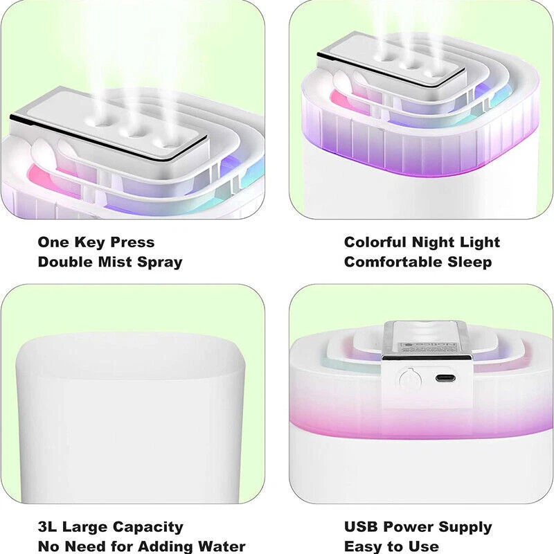 Description: Three Nozzle Humidifier: Ultra Quiet: Auto Shut Off & Safe: Easy to Use: Wide Application: Specification: Material: ABS Color: White Capacity: 2.6-4.0L Voltage & Curremt: 5V / 1A Interface: USB Type-C Atomizer: Three Nozzle Applicable Water: Mineral, Tap Working Time: 10 ~24hrs Dimension: 21 x 15 x 15cm / 8.3 x 5.9 x 5.9in Suitable Scenes: Ideal for bedroom, gaming, sleeping environment, yoga, office, studio, Car, etc. Package Included: 1 x Humidifier 1 x Cable 1 x User Manual Ultrasonic Humidifiers For Bedroom Large Room Office Cool Mist Air Humidifier 3L Description: Three Nozzle Humidifier: The cool mist humidifier has a 3L large capacity which keeps your room humidifier running for up to 24 hours. This three-end spray humidifier can make your skin stay young and relaxed, reducing the chance of skin problems and creating a good living and sleeping environment for your large room, bedroom, etc. Ultra Quiet: With a low noise below 20dB, our cool humidifier offers maximum relaxation during sleeping or working. Just press the key for 2 seconds to get the beautiful and dreamy night light. The optional night light makes your night more comfortable and relaxing. Auto Shut Off & Safe: The large room humidifier will automatically shut off to avoid running out of water, preventing damage to the tank and ensuring your safety, making it a great choice for your bedroom or as a baby humidifier. Easy to Use: The bedroom humidifier has 3 levels of mist output that you can fully customize according to your preferences. Just add cool water into the water tank from the top without the need for frequent refills, and choose your preferred type of cool mist. Press and hold the night light for 2 seconds to turn it on or off. Then you can get a colorful LED night light and an ideal indoor climate. Wide Application: The large opening design enables you to wholly clean the inside of the whole humidifier and better ensures the health and cleanness of each breath. Portable cool mist humidifier for bedroom, office, desk, car, travel, and more. Specification: Material: ABS Color: White Capacity: 2.6-4.0 L Voltage & Curremt: 5V / 1A Interface: USB Type-C Atomizer: Three Nozzle Applicable Water: Mineral, Tap Working Time: 10 ~24hrs Dimension: 21 x 15 x 15cm / 8.3 x 5.9 x 5.9in Suitable Scenes: Ideal for bedroom, gaming, sleeping environment, yoga, office, studio, Car, etc. Package Included: 1 x Humidifier 1 x Cable 1 x User Manual Payment Shipping Return Contact us About us Payment 1.Paypal, Credit Card, G Pay etc, many payment way is accepted. 2.Please be sure your shipping address is correct before make a payment. Shipping 1.We will ship out the item within 1-3 business days after comfirming the payment, appreciate your patience. 2.If the items are broken on the way( we will check the orders clearly before we sent them ),please contact us in 3 days you received it. We will send you a new one or refund your payment. Return 1.We stand behind every buyer.Items can be returned for exchange or refund within 30 days. 2.Please contact us when you have any confusion of our item, we will solve the trouble for you as soon as possible. Contact us 1.This is professional Seller.We will reply your message within 24 hours. 2.Please contact us whenever you have any question about the item. We will deal with it as soon as possible. 3. If you are unhappy with the item or our service,please Contact Us before leave feedback,just give me a chance,thank you! About us 1. Unless specified otherwise, all our products are IN STOCK and are shipped from Local warehouse - Not Overseas! 2. We provide a 30 day Satisfaction Guarantee or your money back (provided items are in the same new and resaleable condition.) 3. We have a PayPal Verified Business Account, please buy with Confidence! 4. Every item will be tesrted before send.We know our products well and if we don't have the answers we will do our best to find them for you! 5. Our friendly team look forward to serving you! Your satisfaction is our No.1 Priority We will do our best to satisfacy you.