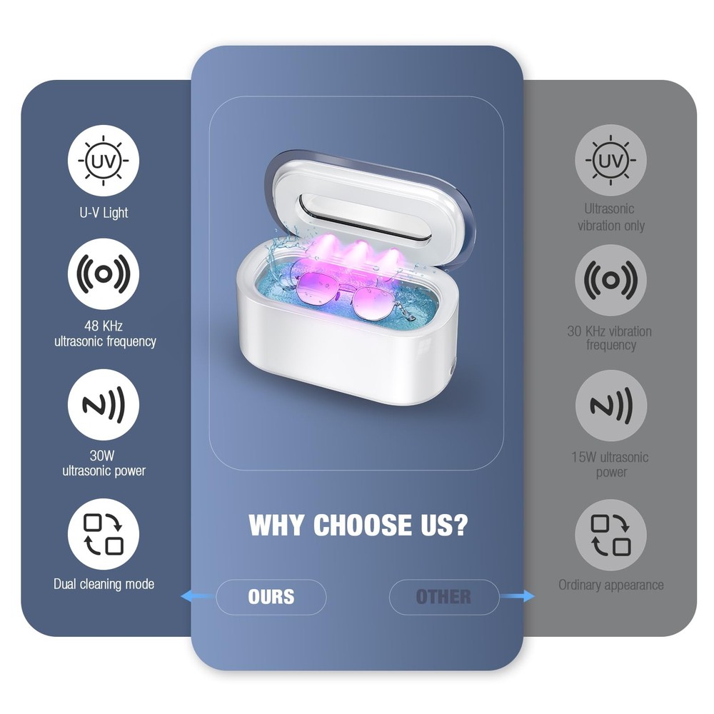 This ultra sonic cleaning machine uses advanced 48kHz high-frequency ultrasonic technology, coupled with 30W strong power to achieve 360° deep cleaning without dead ends, effectively removing stubborn stains and grease on jewelry, glasses, watches and other items, and quickly restoring their original luster. The sonic cleaner provides two modes: 5-minute quick wash and 7-minute fine wash. The LED light enhances the cleaning effect, and one-button operation automatically stops. The ultra sonic jewelry cleaner machine contains a 304 stainless steel liner, a noise reduction design with a working noise of less than 45 decibels, and a non-slip base to ensure stability. The large 350ml/12oz capacity can wash multiple items at the same time, and comes with a cleaning basket. The compact body of 7.67x4.05x3.42 inches weighs only 1.41 pounds, which is portable and practical, and is ideal for home and professional cleaning. Packing list: 1*ultrasonic jewelry cleaner, 1*cleaning basket, 1*power cord, 1*instruction manual, 1*warranty card Efficient Deep Cleaning: With 48kHz high-frequency ultrasonic technology and 30W powerful power, this sonic jewelry cleaner machine can perform 360-degree deep cleaning on jewelry, glasses, waterproof watches, retainers, dentures and other items in minutes. It can effectively remove tiny particles, surface grease and dirt in small grooves and crevices, making the items look brand new. Dual Cleaning Technology: The ultrasonic jewelry cleaner combines powerful ultrasonic and LED light technology to effectively restore the gloss of items and provide excellent cleaning performance. Two cleaning modes are available: 5 minutes (300 seconds) quick cleaning and 7 minutes (420 seconds) deep cleaning. Easy to operate, just add tap water and it will automatically stop working after the preset time. Smart Silent Design: Say goodbye to annoying buzzing sounds, the ring cleaner ultrasonic runs at a noise level of less than 45 decibels. Single click to start general cleaning, double click to start deep cleaning, to meet daily needs. For items with heavy stains, it is recommended to add alkaline cleaning solution for better results. Equipped with a digital countdown function, it clearly displays the remaining cleaning time. Compact & Portable Design: The jewelry cleaner measures only 7.67x4.05x3.42 inches, weighs 1.41 pounds, and has a capacity of 350ml/12oz. It is extremely convenient to carry and store when traveling, and takes up little space on the desktop. It uses a durable 304 stainless steel cleaning tank and is equipped with 4 non-slip rubber pads at the bottom to ensure the long-term stability of the machine. A cleaning basket accessory is included to make cleaning easier. Thoughtful Gifts & After-Sales: The jewelry cleaner has a novel and unique appearance, and the visual upper cover designed with high-end craftsmanship allows you to observe the internal cleaning process at any time. It is an ideal holiday gift for family, friends and lovers. We provide a 1-year warranty service and a 30-day no-reason return and exchange policy to ensure your worry-free shopping. If you encounter any problems, please feel free to contact us for help.