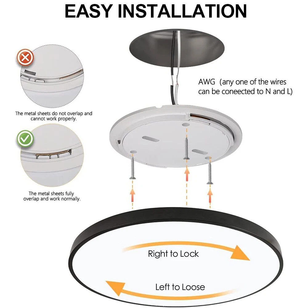 You may also like Retro Ceiling Lamp Fixture Industrial Mental Cage Pendant Lights Cafe Bar Decor 35.19 USD Free shipping Boho Rattan Ceiling Light Chandelier Woven E27 Base 3Bulb Vintage Fixture Wicker 165.59 USD Free shipping Product Description LED Flush Mount Ceiling Light Super Slim 23/30/40/50cm 24W/28W/38W/48W LED Ceiling Light 3 Color Temperature in One 3000K/4000K/6000K Adjustable Ceiling Light fixture for Bedroom Kitchen Dining Room Description: Features: *【High Performance】Our ceiling lamps are integrated LEDs, no bulbs are needed. Four sizes to choose, 9.05inch, 11.8inch, 15.7inch, and 19.6inch, suitable for all size needs. Features AC85-265V 2500lm/3200lm/4200lm/5200 lumens brightness by using only 24W/28W/38W/48W. Energy Savings of up to 90%, for example, the 28W lamp is equivalent to six 40W traditional bulbs(240W). Saving a lot of money on your electricity bills and reducing re-lamp frequency. *【3 Color Temperatures】This flat ceiling flush light has 3 color temperatures, 3000k, 4000k, and 5000k, it is controlled directly by a wall switch, 3 presses for a cycle, no need remote control or app, and is simple to work and operate. Much more durable and Longer lifespan of about 30,000hrs. *【Memory function】Powerful memory function automatically retains the last color temperature. First, turn on the color you want, then turn it off for more than 10 seconds. Turn on the light again you will get back the last setting light color. *【Soft&Bright Lighting】The flush mount LED ceiling light is equipped with high-efficiency LED beads, saving your electricity bills more than traditional LED light bulbs, and protecting your eyes from the glare of traditional lighting. 28W bright and even Lighting easily illuminates a 6-18 square room. Bring you a warm and comfortable feeling for your bedroom, bathroom, and living room. *【Stylish&Thin Design]】 These LED ceiling lights are only 0.9inch thick, well-sealed, and avoid the little bugs, perfect size, and flat ceiling lights well match the ceiling. Modern simple design meets most decoration styles, modern and elegant. *【Easy to install】Very easy to install, only need 3 steps to install. First, connect the AWG, and then fix the base on the ceiling with 3 screws, finally screw the ceiling lamp in the base, and make sure the metal plate inside the lamp is well rotated and stuck at the rightmost of the base, or the ceiling led light may not light up. *【Wide Application】Simple Design of the LED ceiling light can well suit different decoration styles, like living room, bedroom, kitchen, hallway, bathroom(waterproof IP44, no problem for daily use), etc. Energy-saving LED ceiling lights help you to save your electricity bill, a great choice for your home. Specifications: Color: Black Material: PC Working Voltage: AC85V-265V Color Temperature: 3000K Warm White/4500K Natural White/5000K White Power: 24W, 28W, 38W, 48W Diameter: 9.05inch, 11.8inch, 15.7inch, and 19.6inch Thickness: 0.9inch Brightness: 24W: 2500lm, 28W: 3200lm, 38W: 4200lm, 48W: 5200lm Working Temperature: -20℃-60℃ Package includes: 1X LED Flush Mount Ceiling Light Payment Shipping Returns Contact Us Paypal. We only ship to confirmed paypal address. Items are generally dispatched within 1~3 business days after payment is cleared. Please make sure your address in Paypal is matched with your shipping address before you pay. We offer a 30 days return guarantee. If you are not satisfied with the item, you can return it within 30 days after item received. If items have any problem due to quality, please contact us for refund, exchange or a replacement. Please contact us first before item returned. Customer Service from 9:00 am - 6:00 pm on Business Days. Payment Paypal. We only ship to confirmed paypal address. Shipping Items are generally dispatched within 1~3 business days after payment is cleared. Please make sure your address in Paypal is matched with your shipping address before you pay. Returns We offer a 30 days return guarantee. If you are not satisfied with the item, you can return it within 30 days after item received. If items have any problem due to quality, please contact us for refund, exchange or a replacement. Please contact us first before item returned. Contact Us Customer Service from 9:00 am - 6:00 pm on Business Days. powered by
