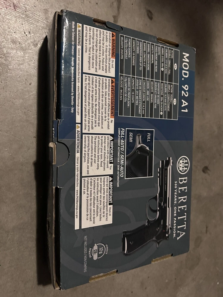 Experience the realistic feel of the Umarex Beretta M92 A1, a top-tier .177 caliber air pistol designed for both hobbyists and serious shooters. This model boasts a 310 fps velocity, ensuring a potent blend of power and accuracy, whether you're target practicing or engaging in outdoor shooting sports. The pistol features a user-friendly semi-auto and full-auto action that offers an authentic shooting experience. Crafted with precision by Umarex, the M92 A1 model uses BB ammunition and comes with the reputable brand's quality assurance, ensuring reliability and consistent performance. This listing complies with eBay's air gun policy and I will only ship air guns to buyers in jurisdictions where permitted to by applicable laws https://www.ebay.com/help/policies/prohibited-restricted-items/airsoft-air-rifle-bb-guns-policy?id=5045 This listing complies with eBay’s air gun guidelines found here and I will only sell and ship air guns to buyers in jurisdictions where permitted by applicable laws, http://pages.ebay.com/help/policies/firearms-weapons-knives.html Shop is not responsible for knowing specific state, county and city laws regarding air guns. It is your responsibility to determine whether it is legal for you to purchase and possess our merchandise in your area. Please research your own local laws and fully comply with them when placing an order on our site. By ordering you represent and warrant that you are 18 years of age or older, you know and are in compliance with all laws in your state, county and city and fully comply with them, and that all other information you provide to us is accurate and complete. Below are EXAMPLES of some state and local Airgun shipping restrictions CA (San Fransico, Zip Codes 941**) IL (Chicago, Zip Codes 606**, 60701, 60706, 60707, 60712, 60803, 60805, 60827) NY (NYC and Burrows, Buffalo, Rochester, Yonkers, Zip Codes 100**-104**, 11004, 11005, 111**-114**, 116**) PA (Philadelphia, Zip Codes 19019, 19059, 19093, 19099, 191**, 19244, 19255) TN (Johnson City, Zip Codes 37601, 37602, 37604, 37605, 37614, 37615) Washington, D.C. (Zip Codes 20001–20098, 202**-205**) CT (Bridgeport, Stratford, and Wethersfield) FL (Miami and Key West) RI (Entire State) We do not ship to Alaska and Hawaii. MUST BE 18+ to Purchase