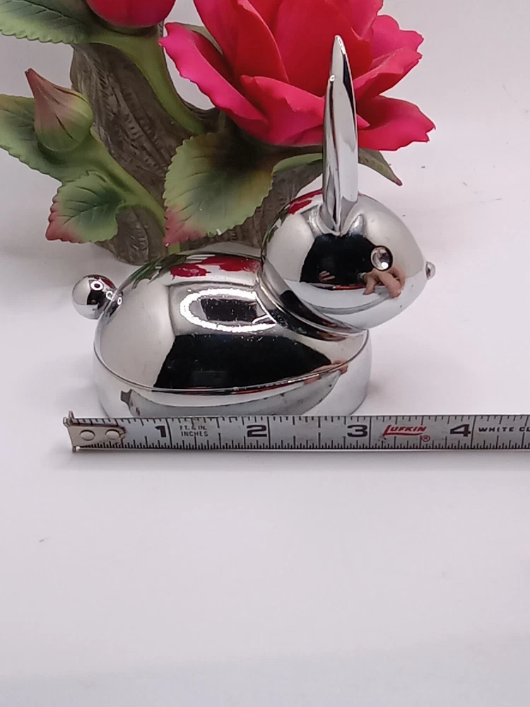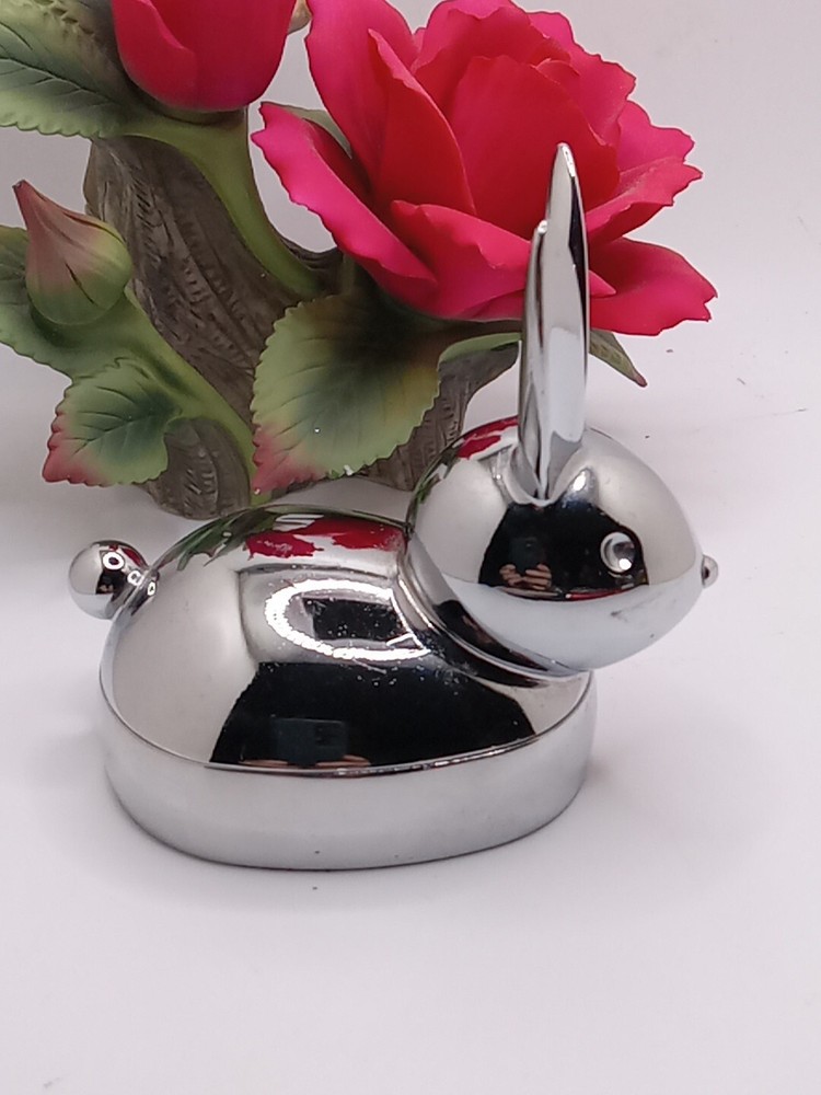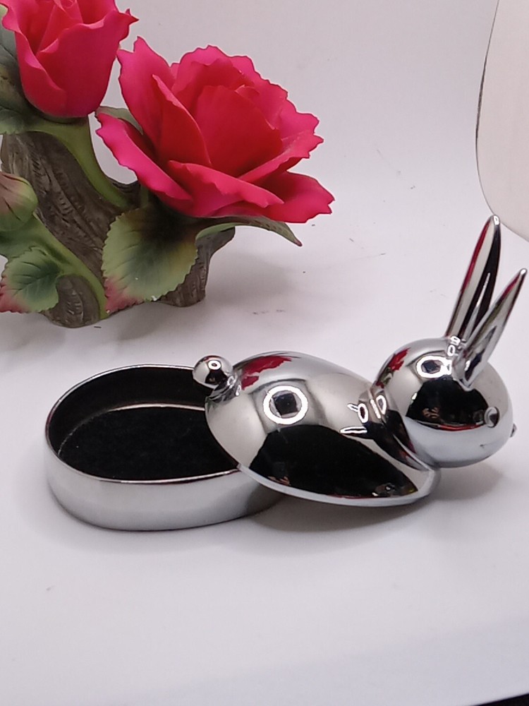 Elevate your jewelry storage with the sleek Umbra Foresta Jewelry Box designed by Alan Wisniewski. Crafted from high-quality metal with a radiant chrome finish, this trinket box is as functional as it is stylish. Its whimsical rabbit shape adds a playful touch to your dresser or vanity, while the silver color maintains a classic appeal that complements any decor. The box is thoughtfully lined with soft microfiber to protect your jewelry from scratches and damage. It's a versatile fit for a range of accessories, including bracelets, cuffs, earrings, necklaces, and rings. Also included are additional items such as a display case, gift box, and jewelry packaging, making it an ideal choice for gifting or personal jewelry organization needs. Please see my other auctions for my other thrift store finds.