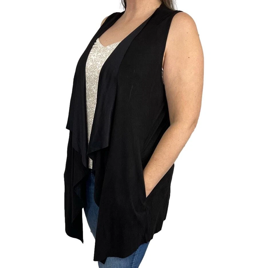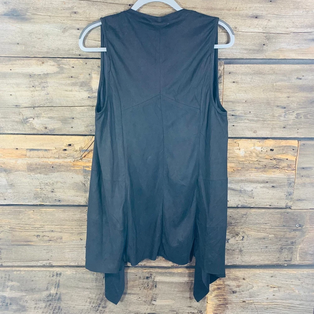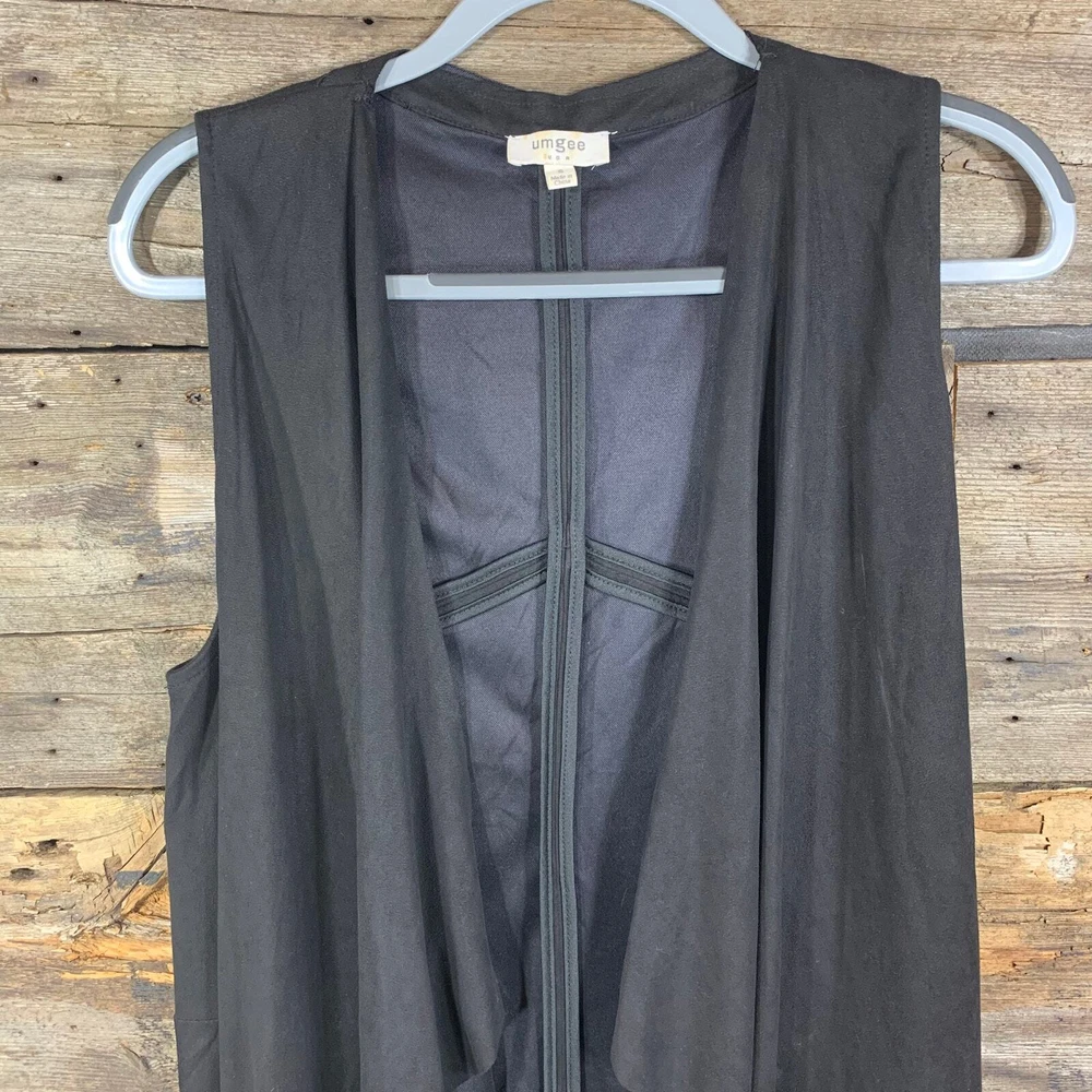 Umgee Black Open Front Sleeveless Asymmetrical Waterfall Cardigan Vest Size: Small 55% Cotton 45% Polyester *Does have a mark on left side of vest as seen in pictures. When vest is worn the spot can not be seen Pit to pit- 17.5" Additional measurements available upon request All measurements are approximate All measurements are taken with item laying flat Double bust, waist, & hip for measurement all the way around Colors may differ based on others computer/phone/etc settings All pre owned items have been washed and steamed All pre owned items have been looked over for flaws and will be noted in listing