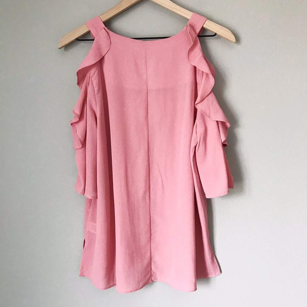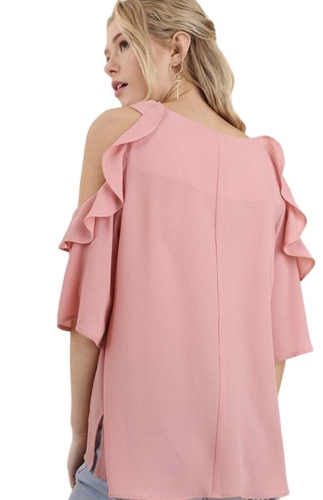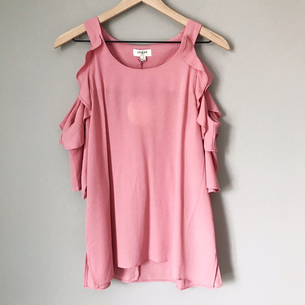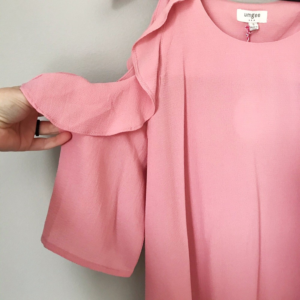 Dive into a world of whimsical charm with the UMGEE Cold Shoulder Ruffle Sleeve Tunic Top. This delightful piece, boasting a round neckline and playful cold shoulder sleeves with ruffle accents, offers a blend of bohemian grace and feminine flair. Its solid pink hue lends a pop of color that's perfect for any wardrobe, making it an ideal choice for a variety of occasions from casual outings to cocktail parties. Crafted from a soft mix of cotton and polyester, this tunic ensures comfort and durability. The size small top is designed to fit regularly, ensuring it drapes beautifully for a look that's both flattering and stylish. Suitable for spring, summer, and fall seasons, it's a versatile addition to your collection, easy to care for with a simple hand wash. All measurements are approximate, not exact. Length: 27.5” Pit to pit: 18.5” measured flat