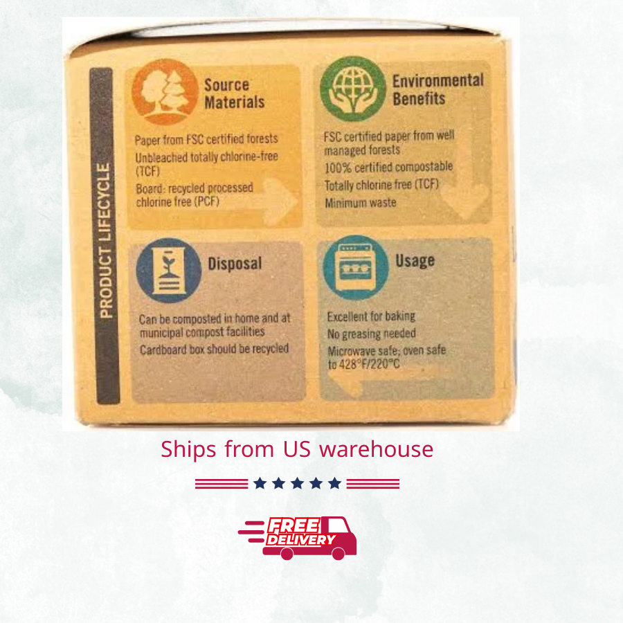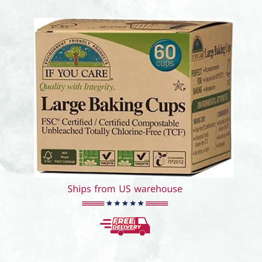 Description Quality with Integrity FSC® & Compostable Certified Unbleached, Totally Chlorine-Free (TCF) Kosher Pareve USDA Certified Biobased Product – 100% Healthy Home • Healthy Planet • Healthy You These may sound like big promises—but to us, they're inseparable. Here’s why: We’re all deeply connected to the world around us. Every choice—right down to the baking cups you use—can have an impact. That’s why we make products that reflect care for your health, your home, and the planet we share. When you care, we do too. And together, we all benefit. Thoughtfully Chosen Materials Paper sourced from FSC®-certified forests Unbleached and totally chlorine-free (TCF) Packaging made from recycled materials Supporting Our World 100% certified compostable (home & municipal facilities) FSC-certified paper from responsibly managed forests Made with minimal waste and no harmful chemicals For Your Home Perfect for baking—no greasing required Safe for microwave use and oven temperatures up to 428°F / 220°C Convenient and reliable—baking made easy Sustainability in Action Baking cups are fully compostable in home or industrial composting systems Recycle the cardboard box after use Suggested Use Cup Dimensions: Use If You Care Large Baking Cups with standard muffin tins. Available in three sizes—choose the one that fits your recipe best. Size shown: Large – 1.96" (50mm) diameter.