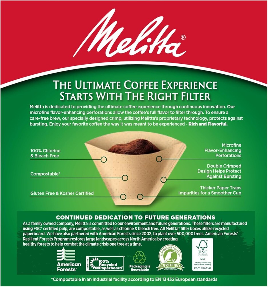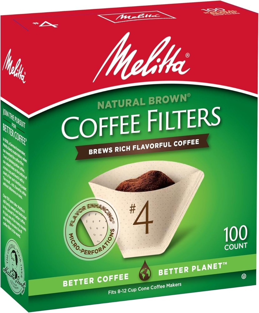 Menu Other Items Feedbacks About Us Contact Us Add To Favorites #4 Cone Coffee Filters, Unbleached Natural Brown, 100 Count (Pack of 6) 600 Total Filters Count - Packaging May Vary Cone Coffee Filters: Premium cone coffee filters will fit all 8 to 12 cup drip coffee makers with a conical shaped filter; Also fits most pour-over coffeemakers that need #4 coffee filters; Traps more bitter oils for a better cup of coffee Advanced Design: Our coffee filters feature Microfine Flavor Enhancing perforations that allow the full coffee flavor to filter through and a double crimped filter design to help protect against bursting Number One Coffee Filter Brand in the World: Our cone, basket and single serve filters are all designed to brew rich, flavorful coffee; They are all compostable and made of high quality paper that won't tear for mess-free brewing Optimal Brewing: Our products are designed to provide optimal extraction resulting in a rich and flavoful cup of coffee which is never bitter Join the Pursuit for Better Coffee: Melitta is dedicated to providing the ultimate coffee experience with our premium coffee filters, coffee pods, pour-over brewers, coffee makers and premium coffees Always store your coffee in an airtight container away from direct light, heat and exposure to moisture. Ground coffee will begin staling soon after the package is opened, so storing it in an airtight container is crucial. An airtight container keeps out odors and protects the internal moisture of the coffee bean, in the case of whole bean. Direct light and heat will begin to degrade the coffee oils, and will affect the flavor and aroma properties. A single pack features 100 Filters (One 100ct Box) and a case pack features 1,200 Filters (Twelve 100ct Boxes) Item Specification Item model number #4 Unit Count 600 Count Material Paper Country of Origin USA Global Trade Identification Number 00055437632171 Item Weight 3 pounds Shape Cone Is Discontinued By Manufacturer No Product Dimensions 13.3 x 10.7 x 8.5 inches Number of Pieces 6 Dimensions Shipping Returns Additional Info Product Dimensions: 10.7 inches x 13.3 inches x 8.5 inches. Weight: 3.0 lb Fast shipping is very important for us. Our standard shipping service is FREE. Your order will be shipped within 1-3 business days upon full payment received. Most items are delivered within 3-5 business days, however, please allow 3-10 business days. We are shipping only to USA. We only ship to the confirmed Paypal address. We reserve the right to cancel any order for any reason at any time. We are not responsible for undeliverable addresses. We offer a 30 day return policy from checkout winning date. Your satisfaction is guaranteed! If for any reason you are unhappy with your item, just return it within 30 days for a full refund, minus shipping cost. Please contact us prior to initiating a return so that we can issue you a refund authorization. Items defective upon receipt must be packaged in their retail packaging as if new and returned with a detailed description of the problem. Return shipping fees are not refundable. We reserve the right to decline any returns if the above guidelines are not followed. All of our items, unless otherwise stated, will only run on 120 volts. Please check to make sure your country complies with these specifications. If you have a problem or question regarding your transaction please contact us before leaving any type of feedback. We will work with you to resolve any problem you may have.