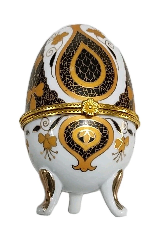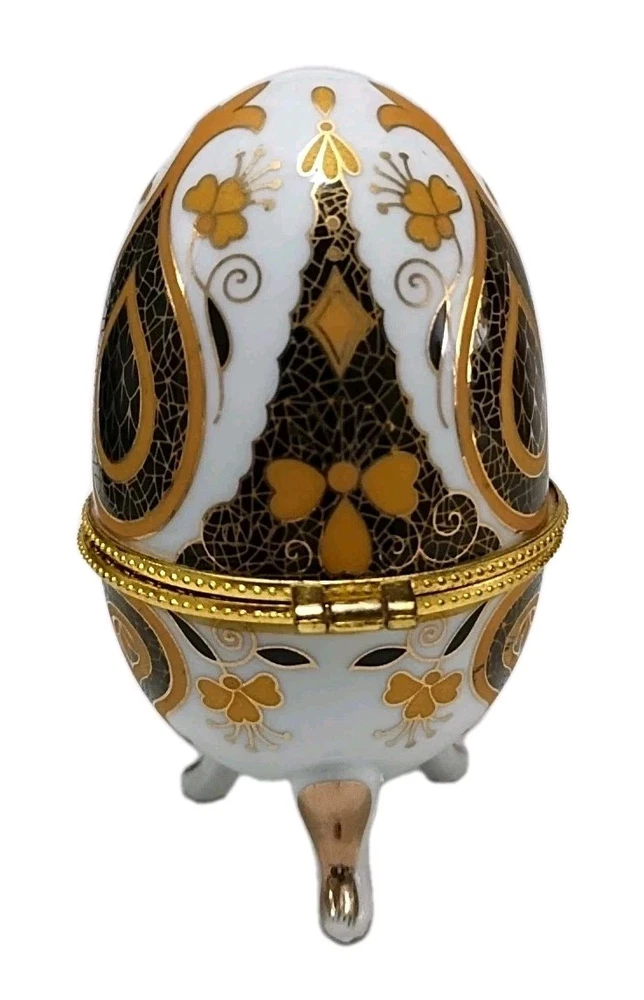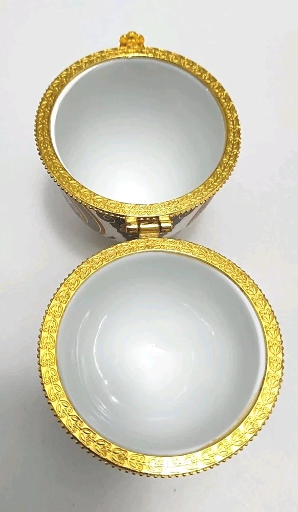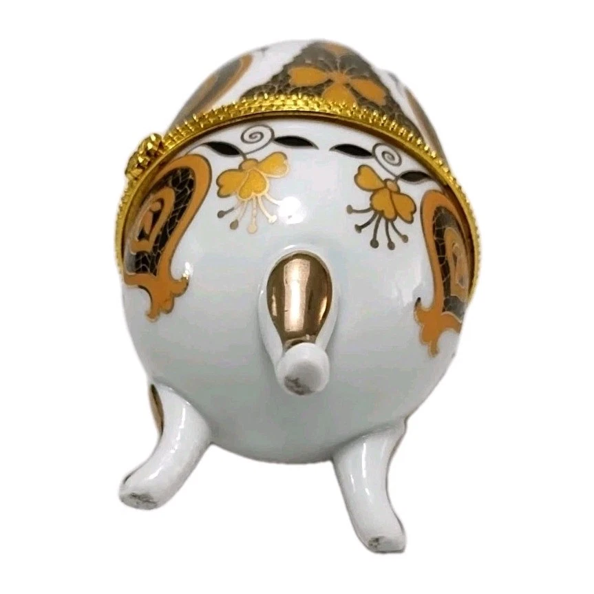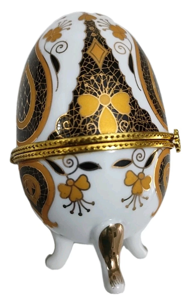 Unbranded Three Legged Egg Shaped Porcelain Trinket Box Gold and Black On White