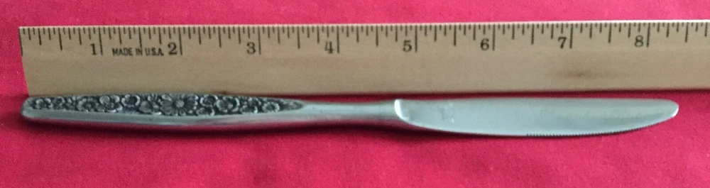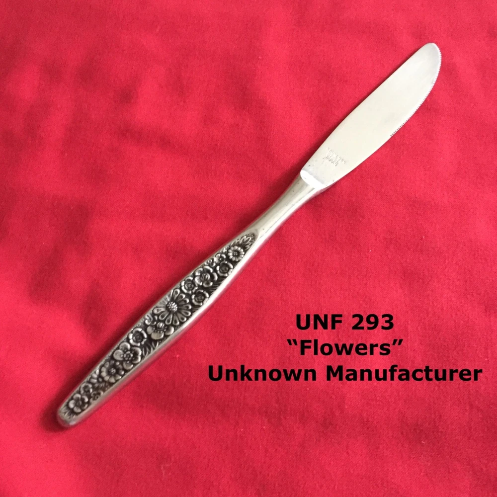 Manufacturer: Unknown Pattern: UNF 293 - Floral Textured Type: Stainless Steel Piece: Dinner Knife Length: 8 1/2"
