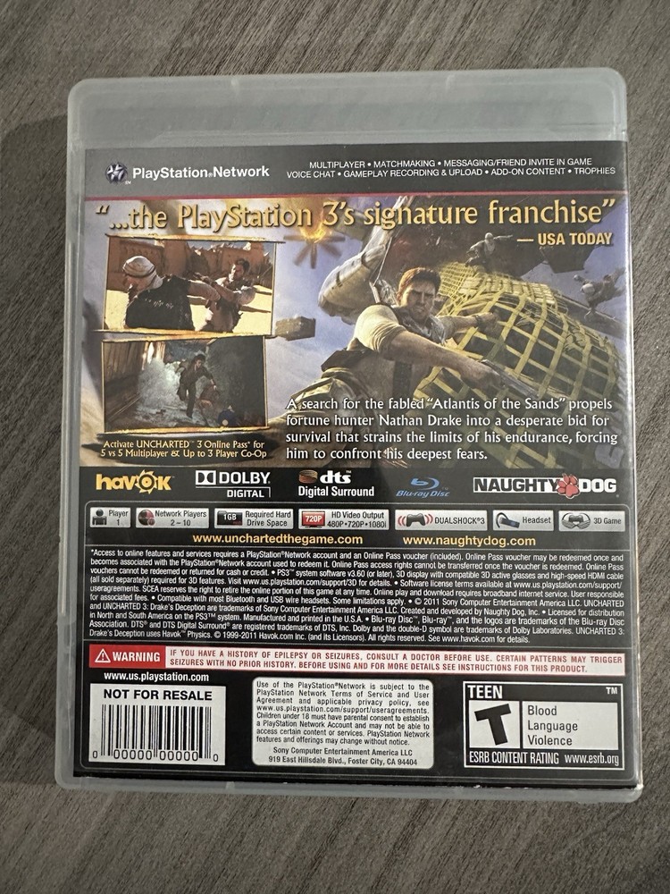 "Uncharted 3: Drake's Deception" for the Sony PlayStation 3 is part of the popular action-adventure series following Nathan Drake's quest to find a lost city in the desert. Released in 2011, this game offers new stealth and melee attack options, as well as updated cooperative and competitive multiplayer modes. With a T-Teen rating, players can expect an engaging storyline and exciting gameplay from the publisher Sony. Join Drake and his companion Victor Sullivan as they navigate treacherous terrain, solve puzzles, and take on enemies in this thrilling installment of the Uncharted series. 12-26-25