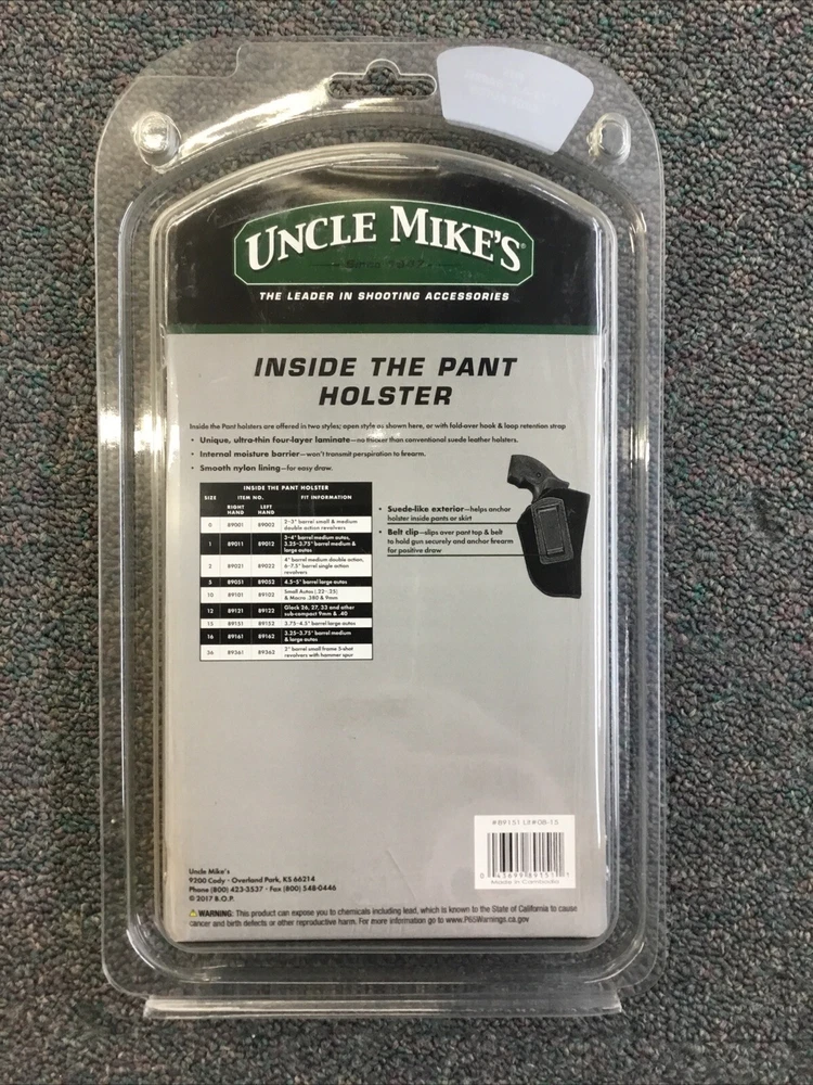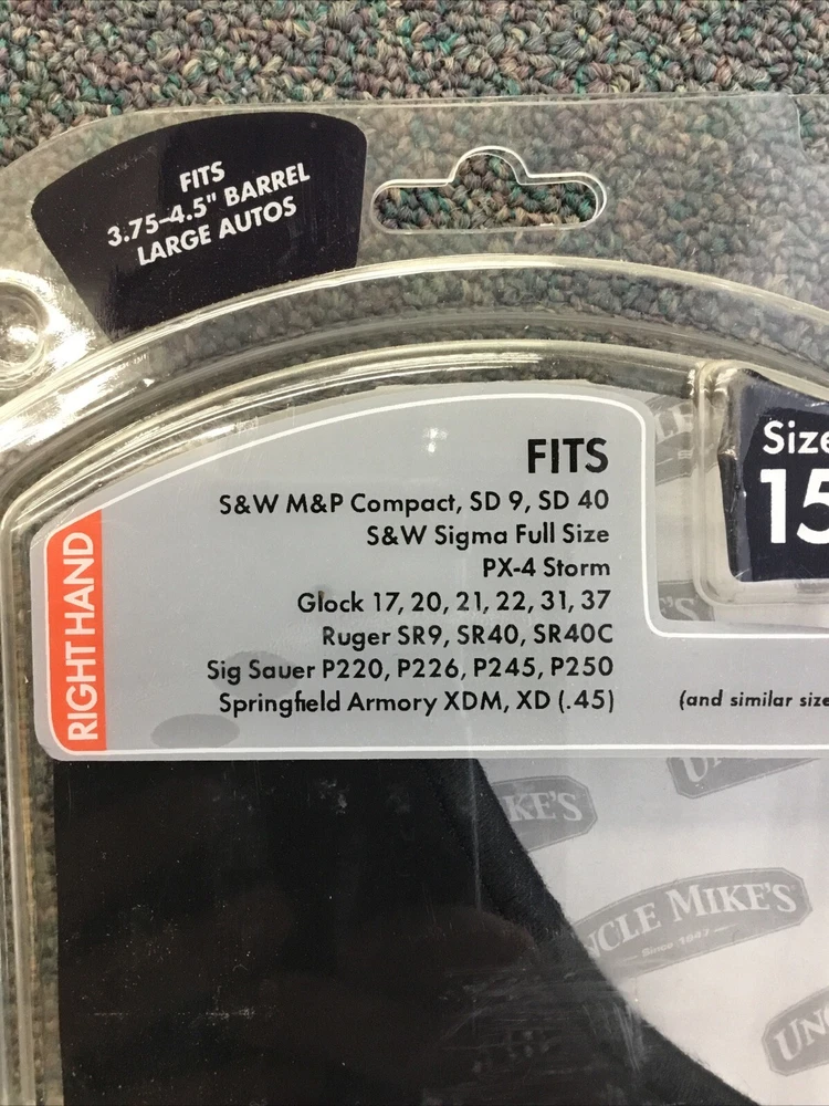For Gun Make:GLOCK, Smith & Wesson, Springfield Armory, Sig SauerFor Gun Type:PistolUPC:0043699891511Handedness:RightMPN:89151gtin13:0043699891511Type:Concealment HolsterBrand:Uncle Mike's
