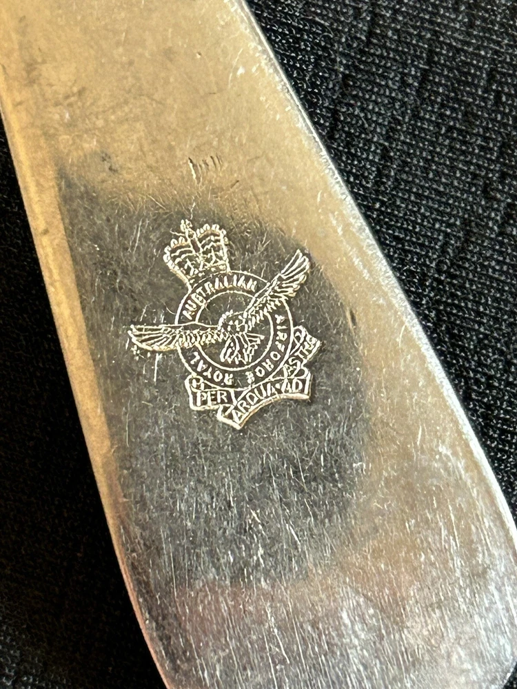 This is an uncommon piece of military history - an Australian Royal Air Force RAF spoon from WWI and WWII. The spoon features the RAF insignia and is a unique addition to any militaria collection. It was manufactured in Australia and is an original piece from the time period. The spoon is a great collectible for those interested in the history of the air forces during WWII. It is an uncommon find and would make a great addition to any collection. The spoon has been well-preserved and is in excellent condition, ready to be displayed or used. If you have any questions please email me and I will respond promptly. Thanks for looking and good luck.
