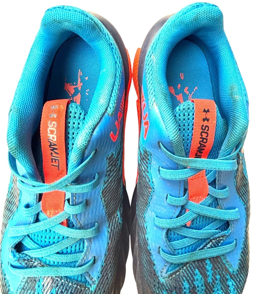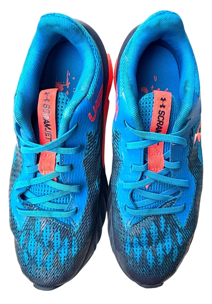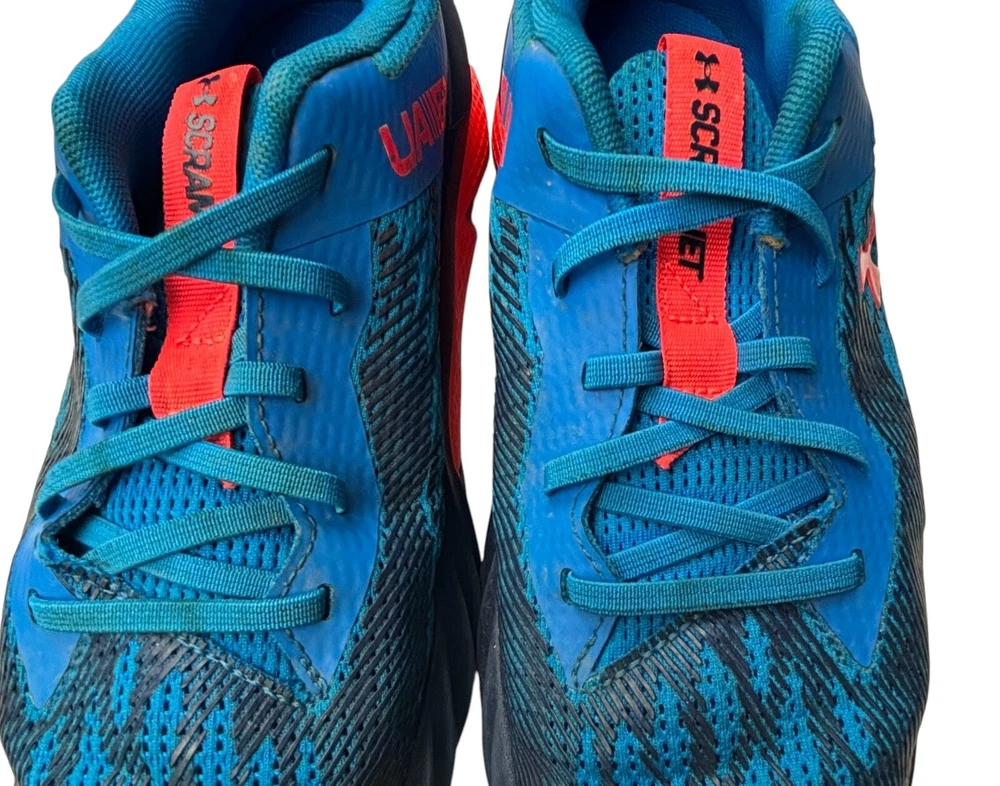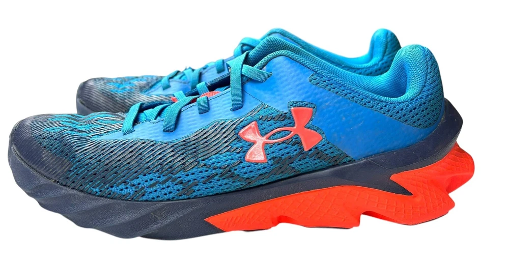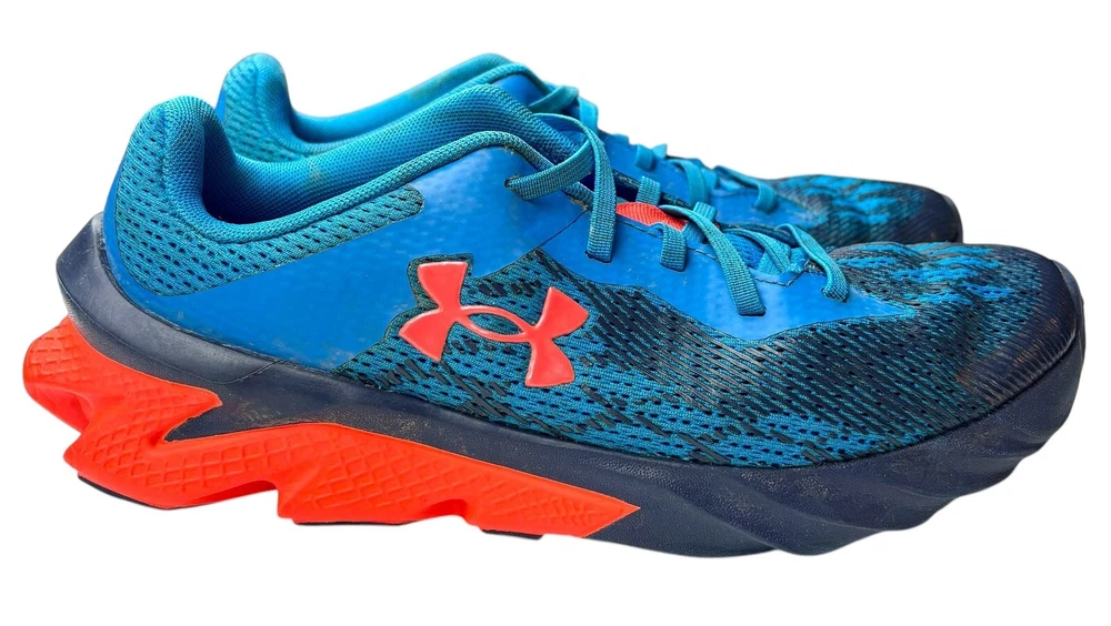 The Under Armour Boys' Size 3Y Grade School Charged Scramjet 3 Running Shoes in Blue and Orange feature a round toe shape with a pull-on closure for easy wear. These athletic sneakers are designed for activities like walking, running, and school, offering moderate cushioning and breathability with a rubber outsole for traction. The shoes have a mesh upper material and foam insole for comfort, making them ideal for casual wear, activewear, and travel during all seasons. Perfect for young boys who enjoy staying active and stylish. There is some wear and staining as shown in photos.