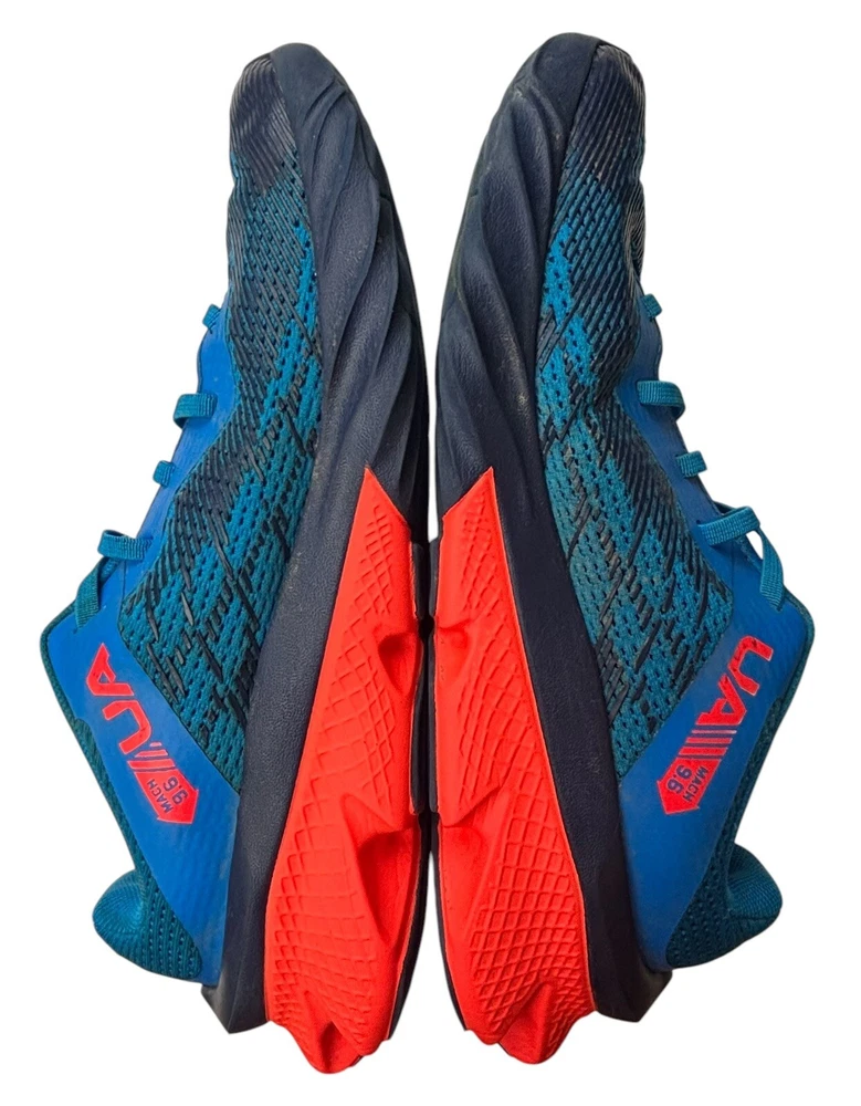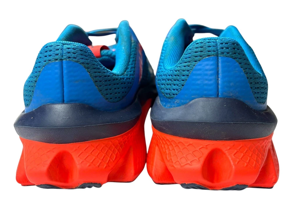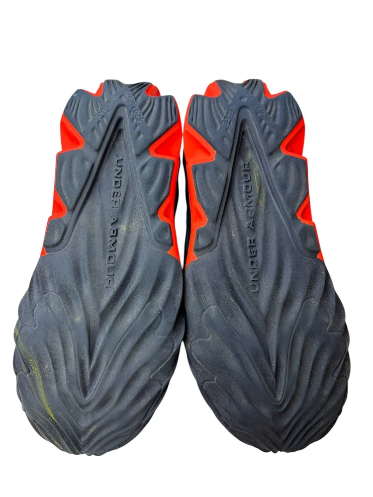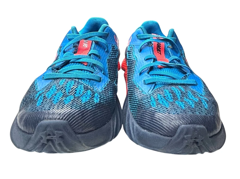 The Under Armour Boys' Size 3Y Grade School Charged Scramjet 3 Running Shoes in Blue and Orange feature a round toe shape with a pull-on closure for easy wear. These athletic sneakers are designed for activities like walking, running, and school, offering moderate cushioning and breathability with a rubber outsole for traction. The shoes have a mesh upper material and foam insole for comfort, making them ideal for casual wear, activewear, and travel during all seasons. Perfect for young boys who enjoy staying active and stylish. There is some wear and staining as shown in photos.