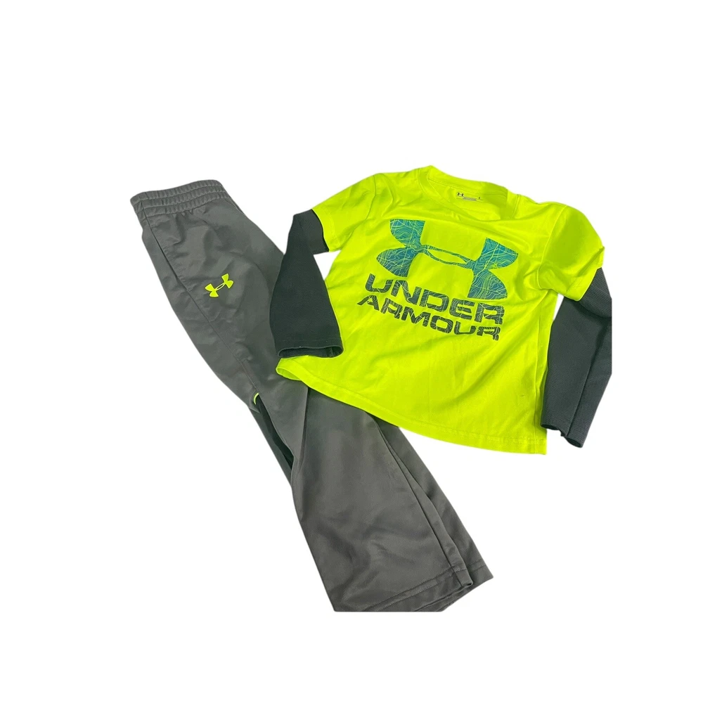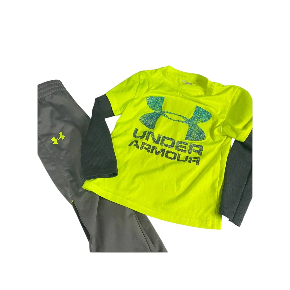 This is a two-piece set for boys size 4 by Under Armour. It includes athletic pants and a top with the UA logo. The set is in gray and yellow colors, made of 100% polyester fabric. The pants have a pull-on closure and a solid pattern, suitable for activewear or casual occasions. The outfit is designed for athletic performance and features the UA Under Armour Words character family. in good condition All Measurements Are Approximate Please email us with any questions! ** LIKE THE ITEM BUT NOT THE PRICE, REASONABLE OFFERS ACCEPTED