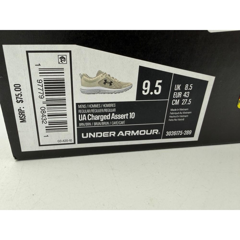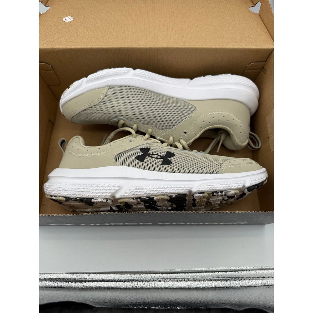 Under Armour Charged Assert 10 running shoes provide a lightweight and breathable feel for daily training or casual wear. These sneakers feature a mesh upper with synthetic overlays for added durability and support where it's needed most. The Charged Cushioning midsole uses compression molded foam for ultimate responsiveness and energy return, while the solid rubber outsole covers high-impact zones for greater durability with less weight. A marble-patterned outsole adds a unique visual touch to the neutral tan and white colorway. Brand: Under Armour Model: Charged Assert 10 Style Code: 3026175-289 Color: Tan/White/Black Upper Material: Mesh/Synthetic Midsole: Charged Cushioning Outsole: Rubber Closure: Lace-up Arch Support: Neutral Heel Pull Tab: Yes Padded Collar: Yes Insole: Comfort Deluxe System Keywords: Athleisure, Gym, Training, Jogging, Neutral Runner, Breathable, Lightweight, Sporty, Earth Tones, Marbled Sole, UA Charged, Comfort, Performance If you have any additional questions, please don't hesitate to contact me direclty.