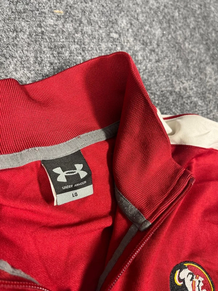 Show your support for the Florida State Seminoles with this Under Armour men's full-zip jacket. The red and white design is perfect for game day or everyday wear. Made with high-quality materials, this jacket is durable and comfortable. It's available in size L and features the team's logo on the front. Whether you're a fan of the sport or just looking for a stylish addition to your wardrobe, this jacket is a must-have.