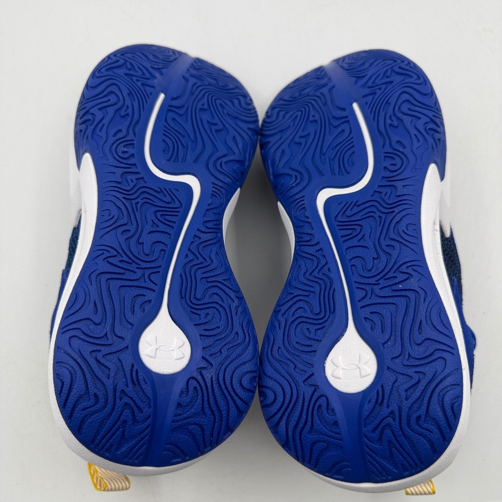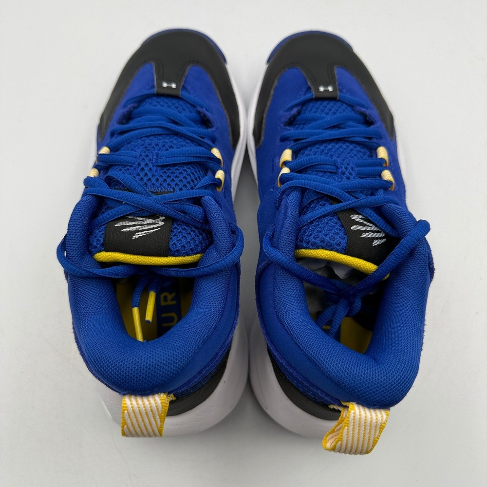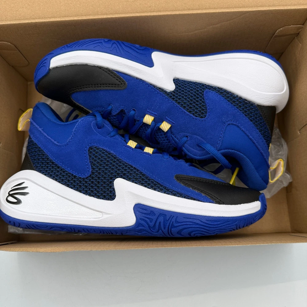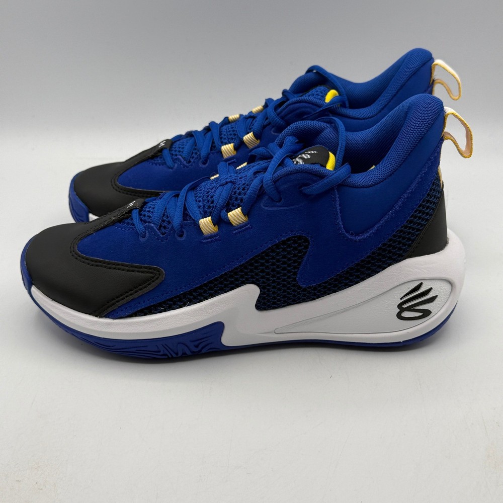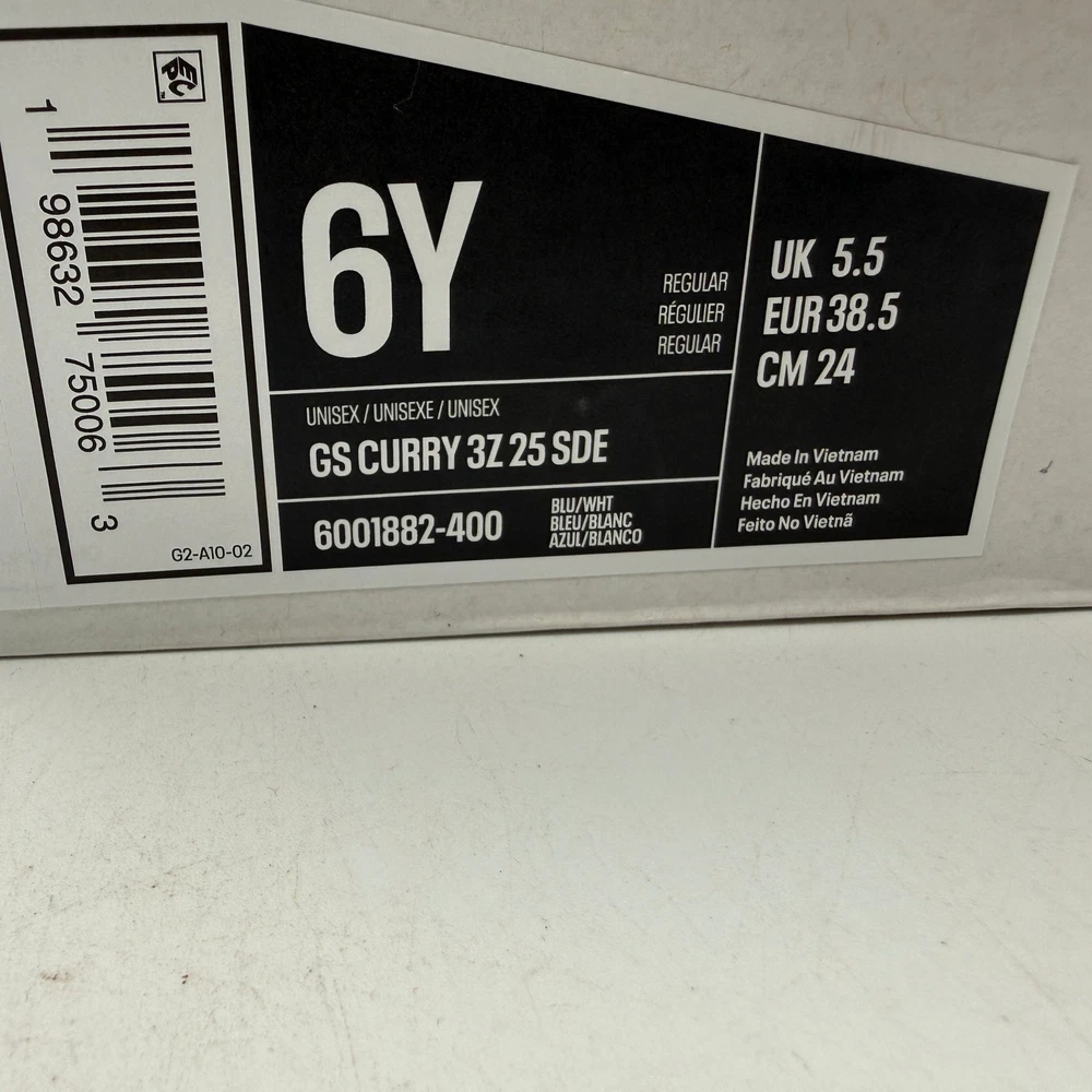 Under Armour GS Curry 3Z 25 SDE basketball shoes offer high-performance support for young athletes. These mid-top sneakers feature a vibrant blue suede and mesh upper with contrasting black overlays and yellow accents. Designed with a durable rubber outsole for superior traction on the court, they include a cushioned midsole for impact protection and a secure lace-up closure. The Curry brand logo is prominently displayed on the side and tongue, making these a stylish choice for both competitive play and casual wear. Brand: Under Armour Model: GS Curry 3Z 25 SDE Style Code: 6001882-400 Color: Blue/White/Black Size: 6Y Gender: Unisex Kids Upper Material: Suede and Mesh Outsole Material: Rubber Closure: Lace Up Heel Height: Mid Top Performance: Basketball Features: Cushioned Midsole, Pull Tab Pattern: Colorblock Keywords: Stephen Curry, Warriors, Basketball Sneakers, Athletic Footwear, Youth Sports, Court Shoes, GSW, Dub Nation, Performance Gear, Streetwear, Suede Sneakers, Blue Shoes, High Top, Underarmour Curry If you have any additional questions, please don't hesitate to contact me directly.