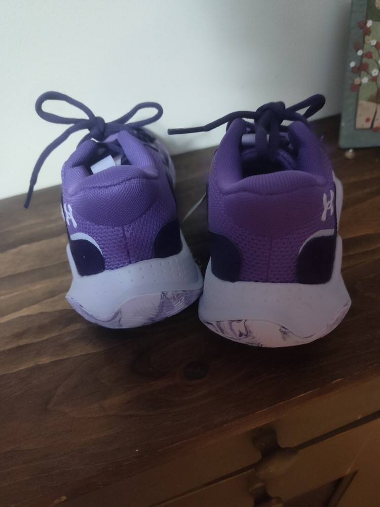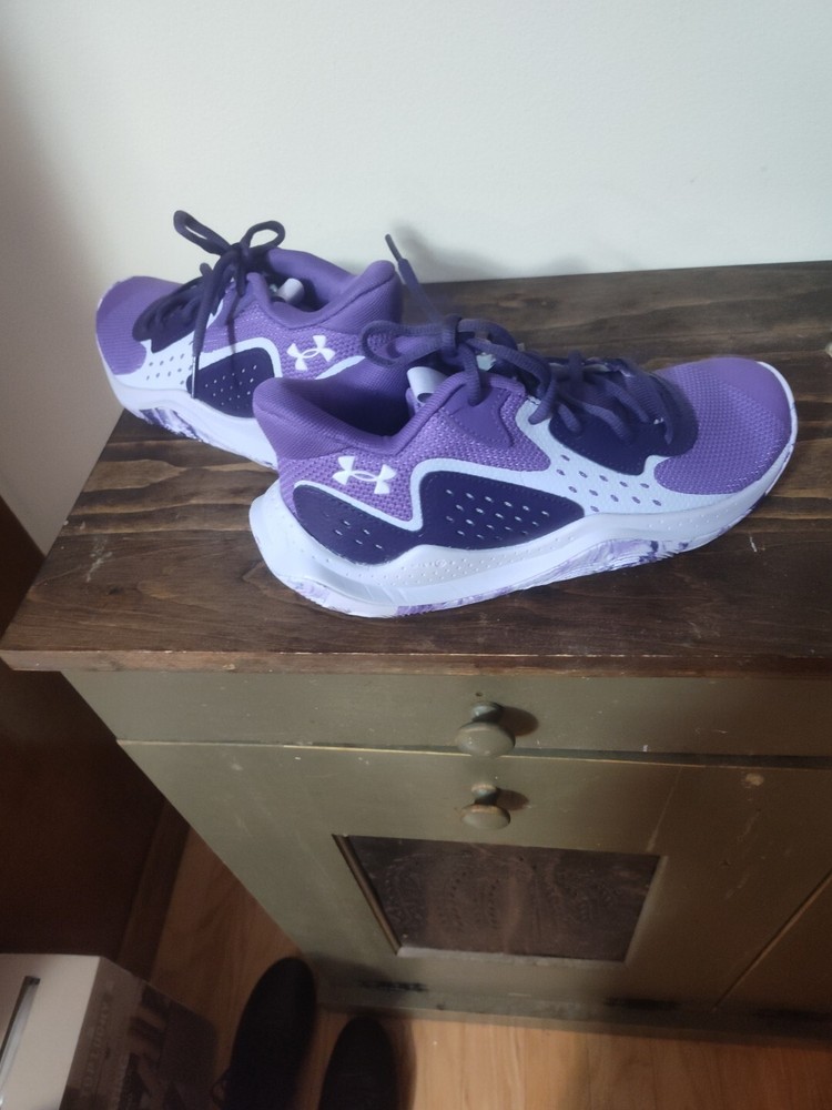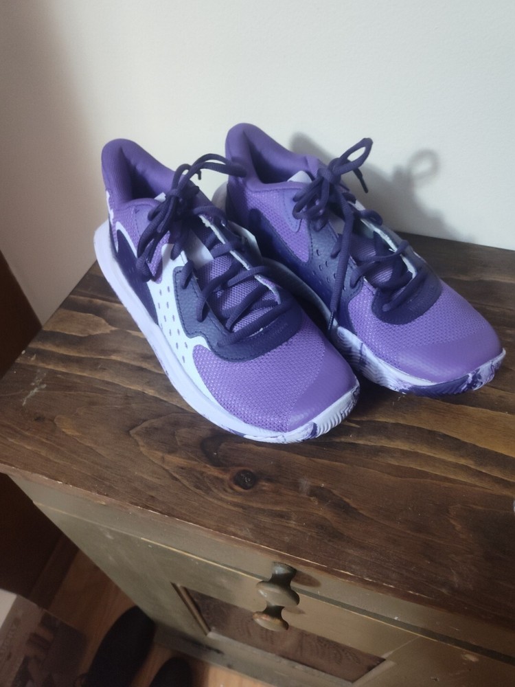 The "Under Armour GS Jet 23" is a unisex basketball shoe in size 6Y with a closed toe design and lace-up closure. It features a high-top shoe shaft style with a white color and solid pattern, suitable for activewear and casual occasions. The shoe is from the 2023 collection, made of a blended fabric upper material with a rubber outsole. This Under Armour model offers LED lights, cushioning, and breathability, making it a comfortable and performance-driven choice for young athletes or casual wear.