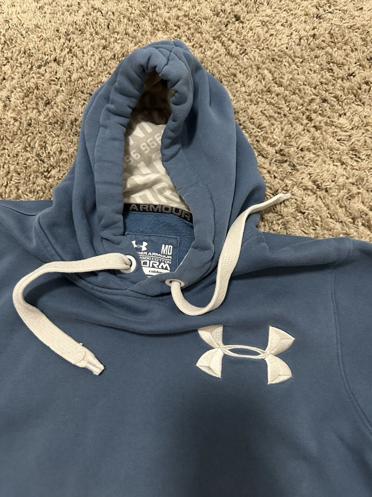 Under Armour Hoodie Size Medium Charged Cotyon Storm coldgear loose Teal/blue color with white logo. Drawstrings intact! Front pocket. One elbow has minimal wear. Item is in good condition. Clean! No stains or holes. Machine washable.