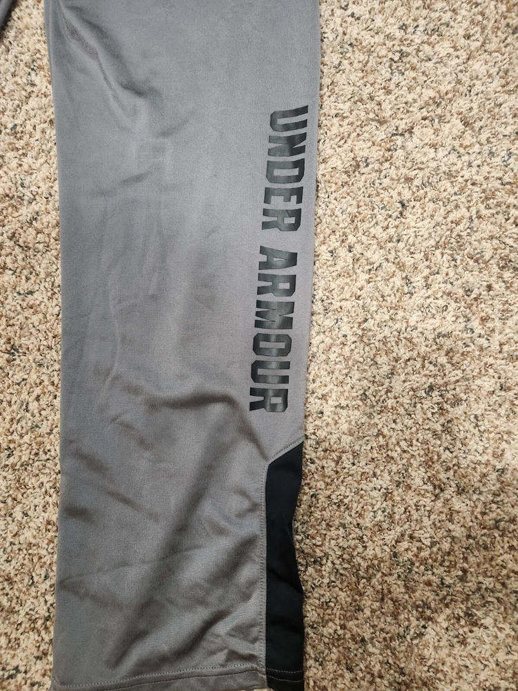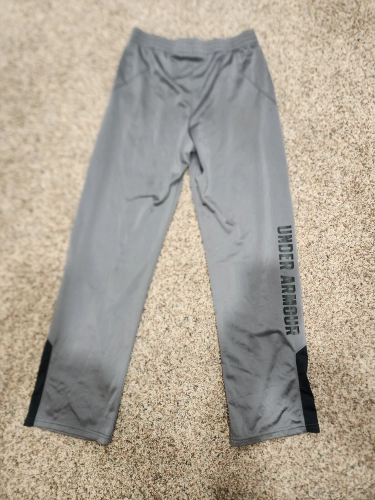 These Under Armour Knit Pants are designed for boys in size YXL with a loose fit style. They feature an elastic waist for comfort and ease of wear, along with pockets for added functionality. The pants are in a gray color scheme with the Under Armour logo as an accent. Made of polyester knit fabric, these athletic sweat pants are suitable for various activities like gym training, baseball, basketball, and more. Perfect for an athleisure look, these pants are a versatile addition to a young athlete's wardrobe.