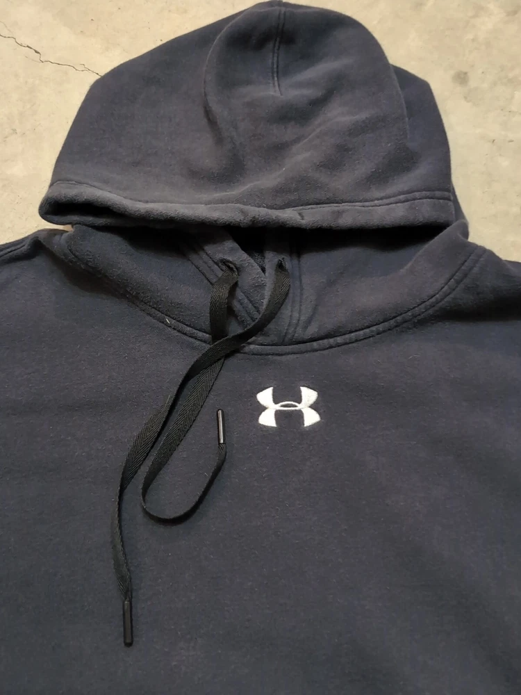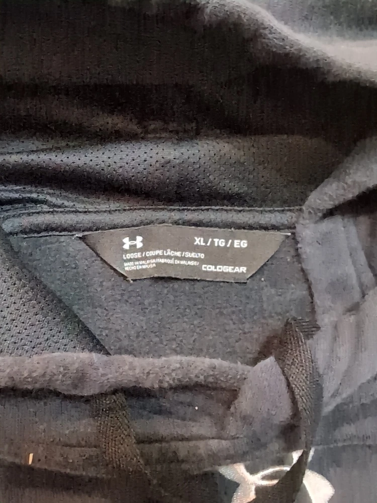 24.5x30 Elevate your workout gear with this Under Armour men's hoodie in size XL. The pullover style hoodie features a solid black color with the brand's logo accentuated on the center. The long sleeve hoodie is designed with a drawstring closure and hooded features for added warmth and comfort during outdoor and sports activities. The hoodie also comes with pockets to keep your essentials close at hand while you focus on your training and running routine. Its loose fit design provides room for movement during gym and training sessions, walking, and running and jogging. This hoodie is perfect for any sports enthusiast who wants to stay comfortable and stylish during their workout routine.